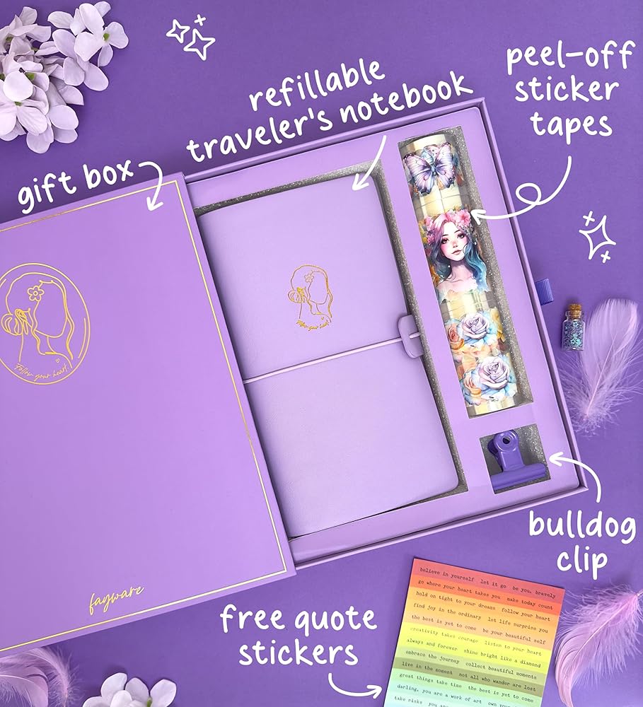 Fayware Creative Scrapbook Journaling Kit - Refillable Traveler's Notebook with Blank, Junk Journal, Bullet Journal, 3 Pre-Cut PET Tapes & Purple Journal Clip. Cute Journal Gift Set for Women