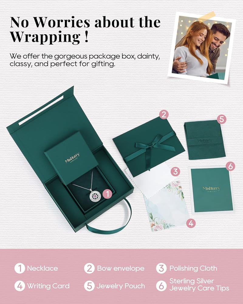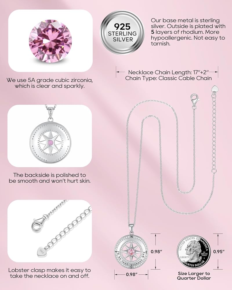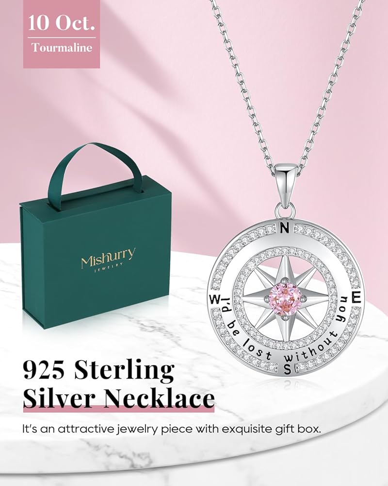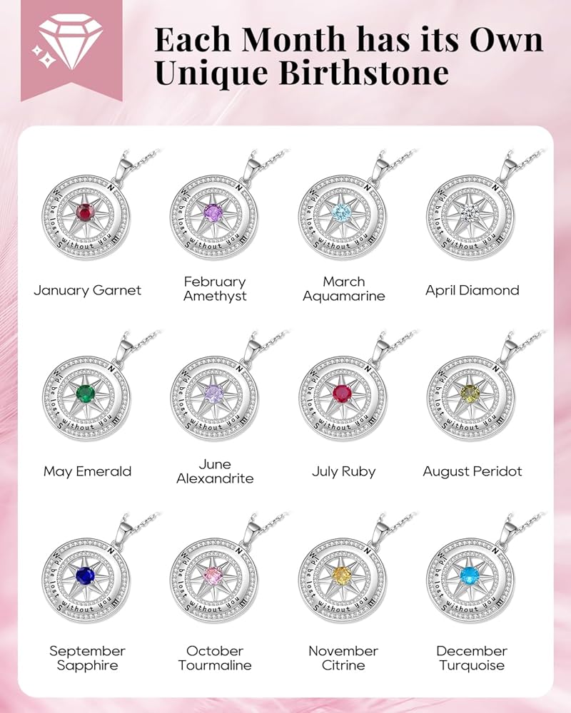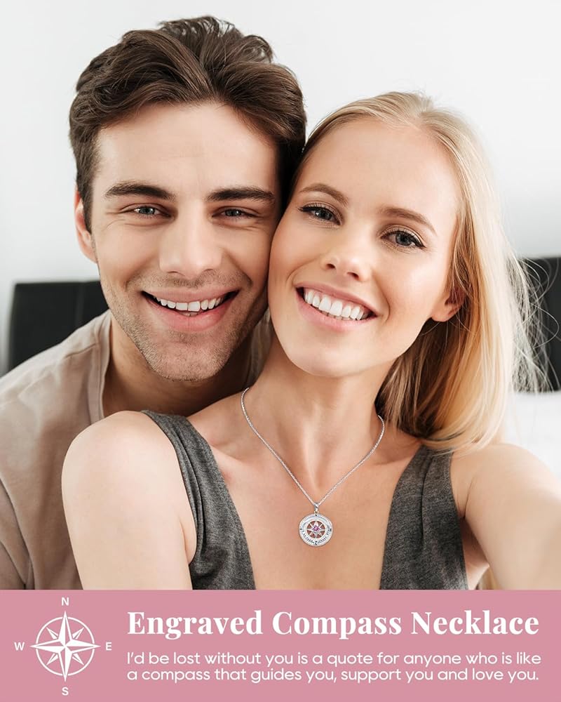 925 Sterling Silver Compass Necklace for Women, Wife Anniversary Necklaces for Her, Love Jewelry for Girlfriend Birthday Valentines Day Christmas, Mothers Day Gifts for Mom, Birthstone Pendant Engraved with I'd be Lost without You