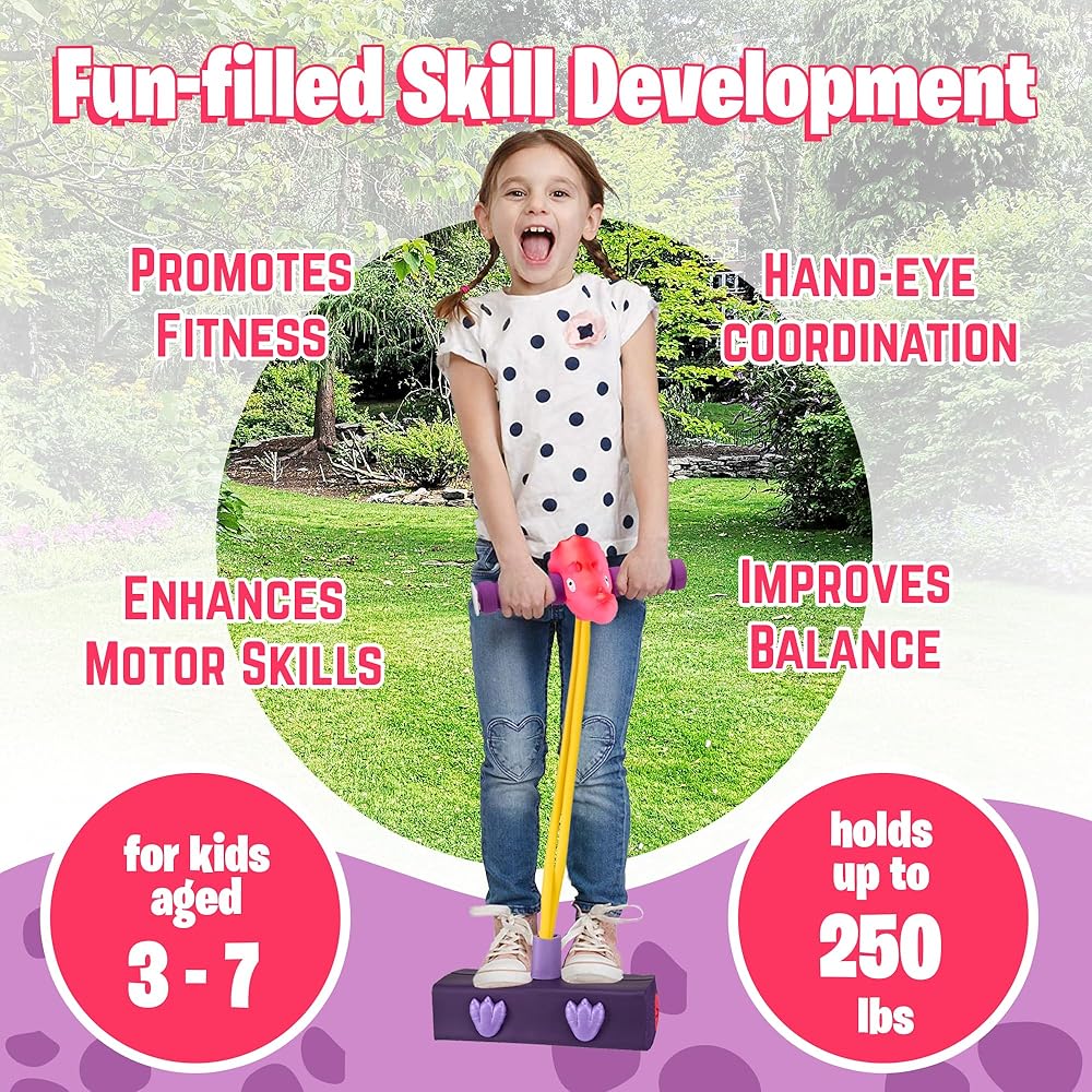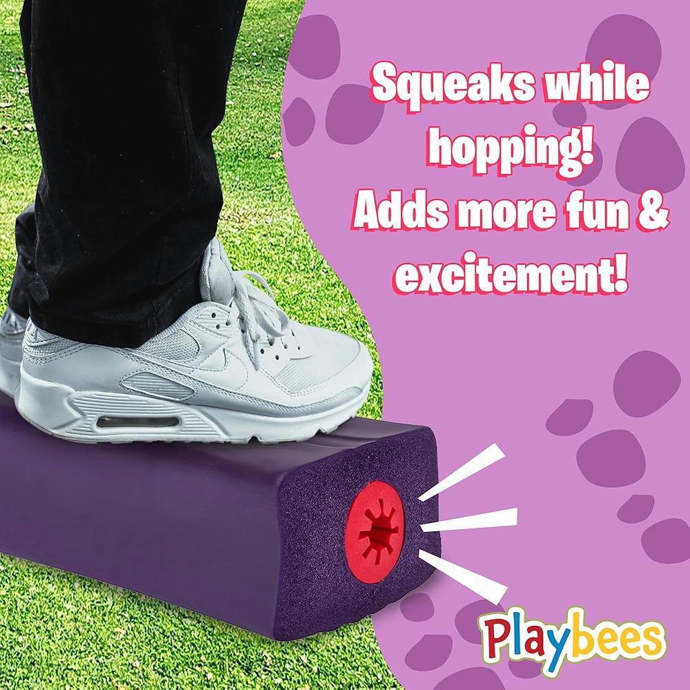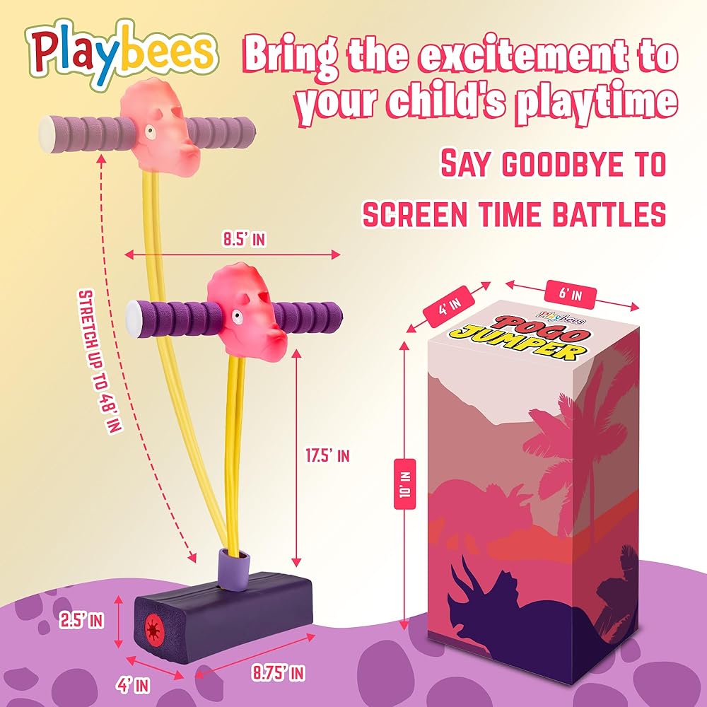 Introducing Playbees Pogo T-Rex, the foam pogo jumper designed for endless fun and adventure for kids aged 3 to 7 years. This bungee foam pogo stick features an exclusive soft foam dino head and claws, making it a must-have for little ones who love dinosaurs. Pogo T-Rex ensures both indoor and outdoor excitement without causing damage to floors. Crafted from strong polyurethane and foam, this durable pogo stick is built to last for years, accommodating kids of all sizes, up to 250 pounds. Say goodbye to tablet battles as Pogo T-Rex becomes the perfect excuse for toddlers to get active. No need to ask; they'll WANT to play with their dino-themed pogo stick, hopping, squeaking, and roaring with joy. Not just fun but also beneficial for skill development, Pogo T-Rex promotes balance, coordination, fitness, and motor skills. This simple, fun, and safe activity toy requires no batteries or electronics—just grab and hop. It makes an ideal birthday gift and Christmas present for 4-5-year-old boys and girls. Playbees stands behind its toys, and if, for any reason, you're not satisfied with Pogo T-Rex, return it for a full refund, no questions asked. Bring the roar of excitement to your child's playtime with the playful and durable Pogo T-Rex foam pogo jumper.