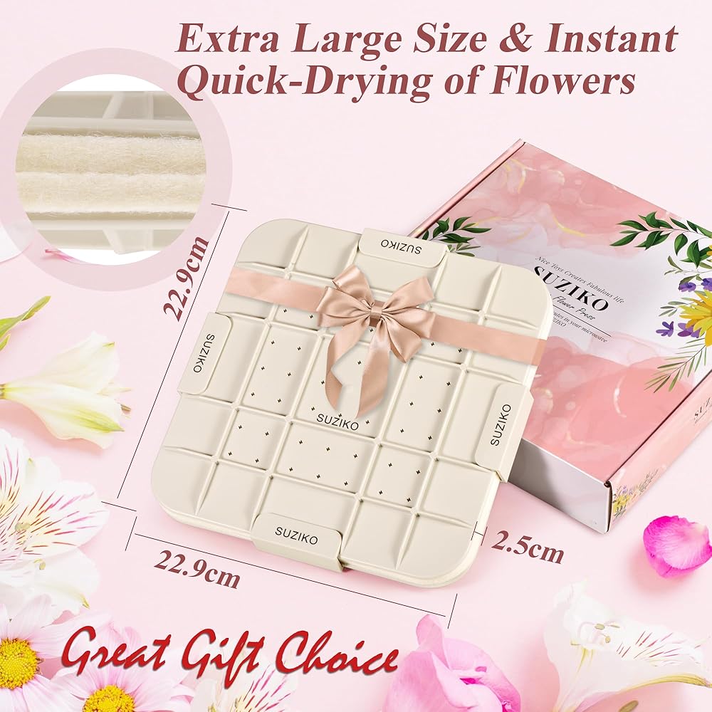 Suziko flower press is Easy to Use: 9" *9" (23 cm)inch. put your flower in the pad, fix the press kit and put your flower press kit in the microwave for a few seconds, you will get fully dried flowers after a few repetitions of this step.