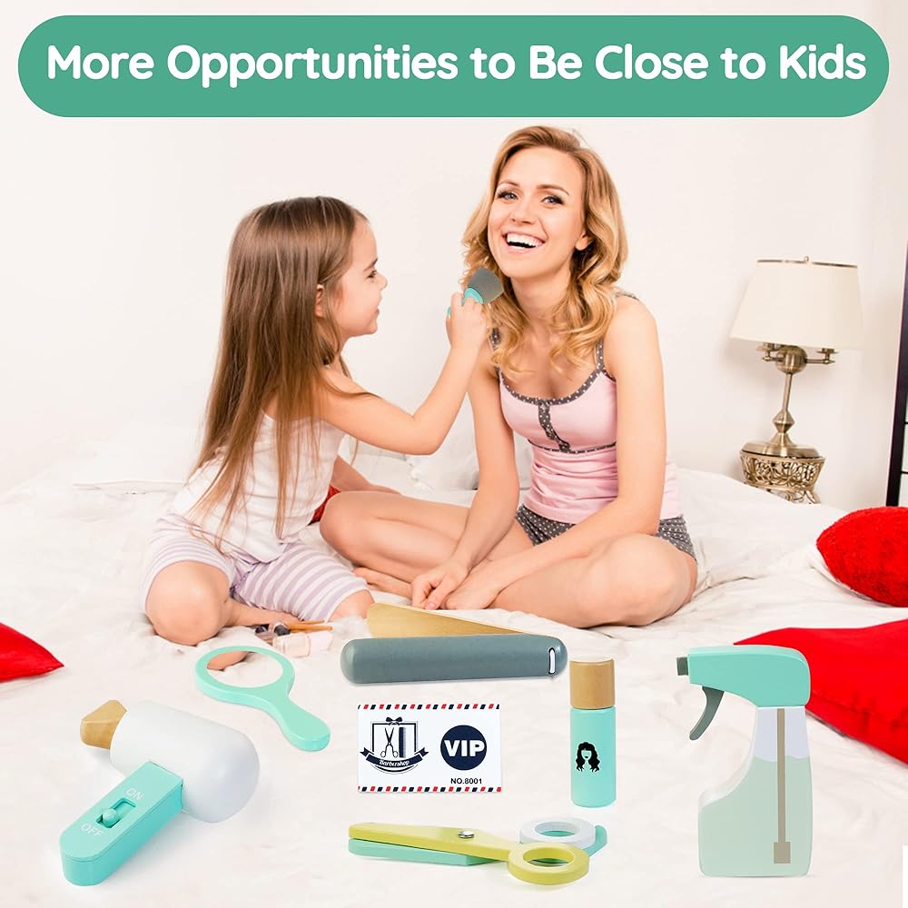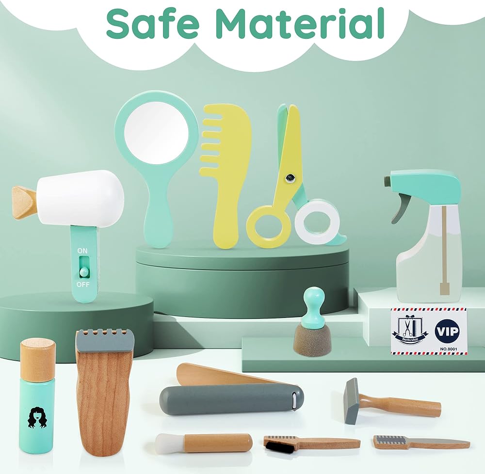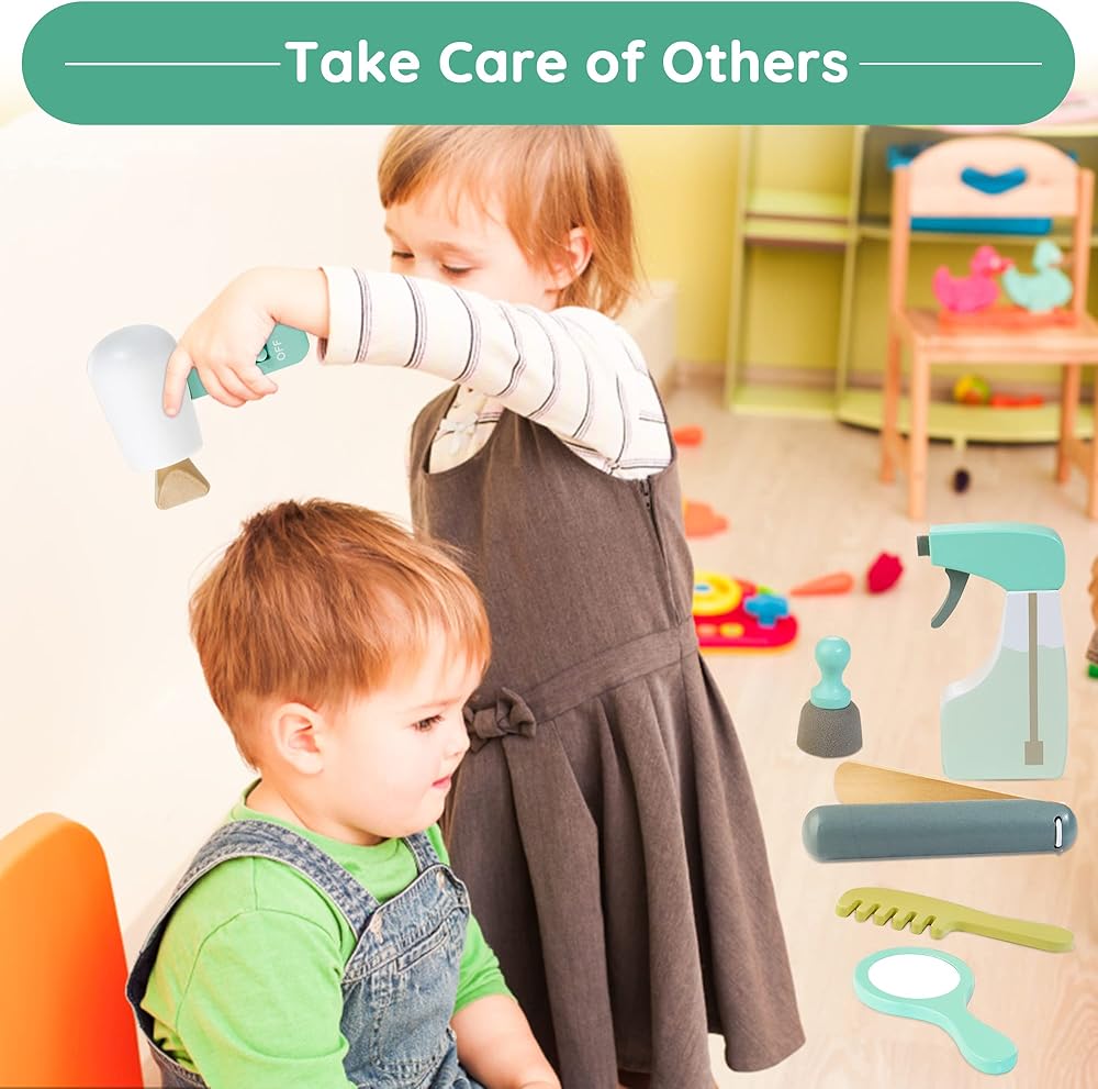 WOODEN MAKEUP TOY SET: Parents need to develop their children's self-care ability. Treewant wooden hair stylist toy simulates hairdressing to let babies know how to take care of themselves and others, developing a confident and independent character in the hands-on process.