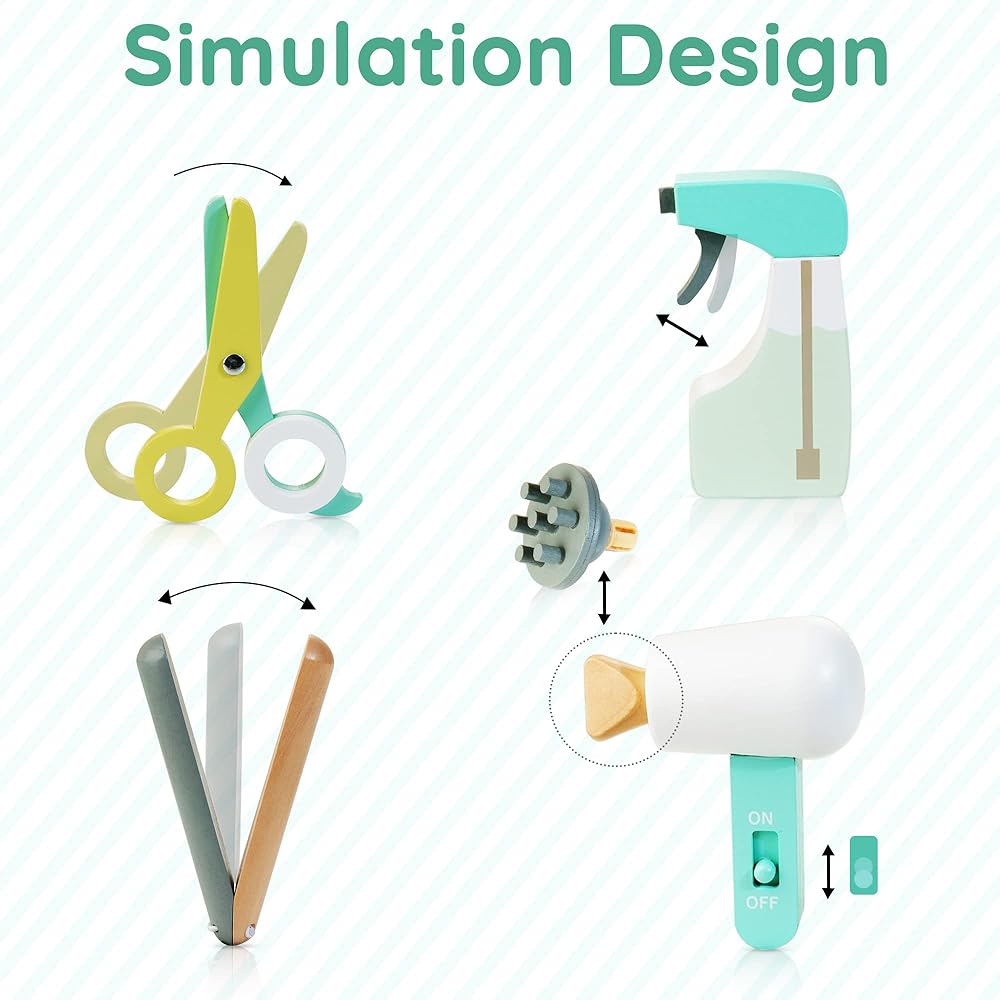 SIMULATION DESIGN: We apply imulation design to our kids hair salon playset. The hair clipper can be moved like real scissors, the hair dryer's switch button can be pushed and pulled, and the hair dryer's mouthpiece can be replaced. The package includes all of accessories needed to play at a hair salon, allowing kids to fully immerse themselves in the barber pretend play.