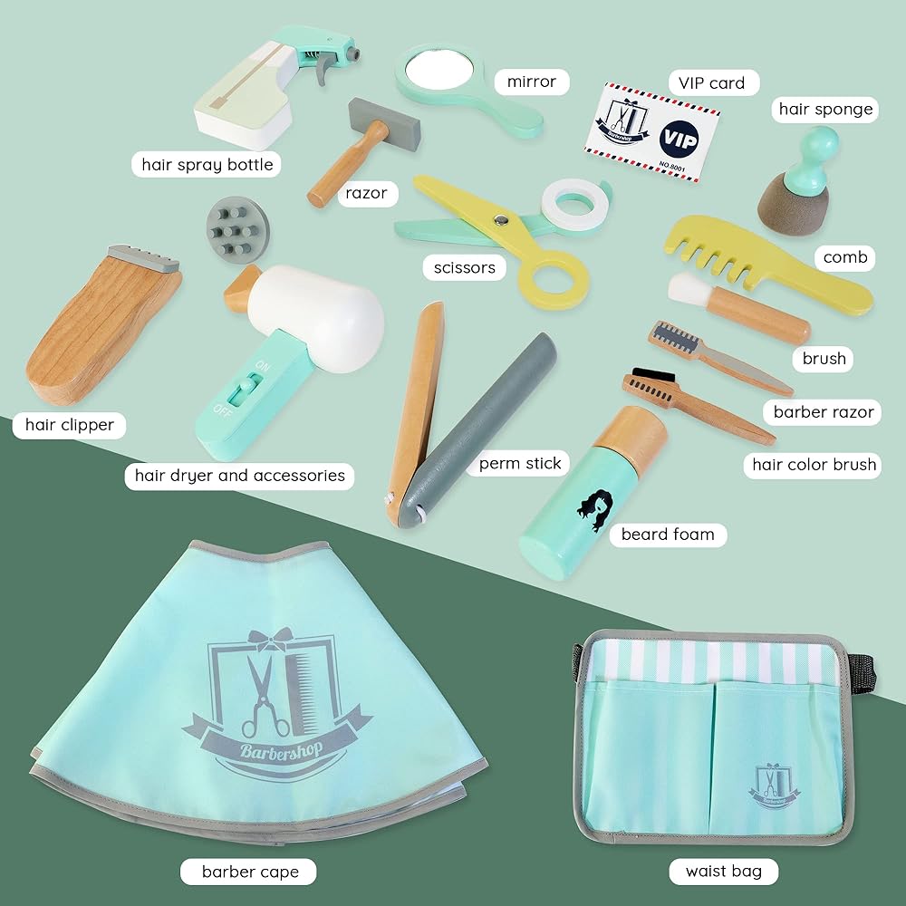 Kids Hair Salon Playset, Wooden Makeup Toy Set, Hair Styling Toys for Girls, Kids Shaving Kit for Boys, Barber Playset, Gifts for 3-5 Year Old Girls & Boys (18 PCS)