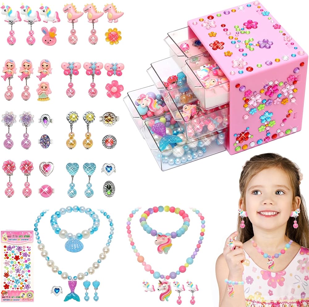 Amazing Mess-free & Easy to Store jewelry organizer: Play jewels for little girls come in a pink jewelry organizer with 6 drawers box, easy to store, perfect toys for 3 4 5 6 7 8 9 10 year old girls to having a good storage habit after pretend play. Toys for girls 8-10 have a brilliant DIY gem diamond sticker, girls can stickers to bling out their own unique jewelry box. Kids toys for girls include necklaces with matching bracelets, rings with matching earrings, offer hours of entertainment