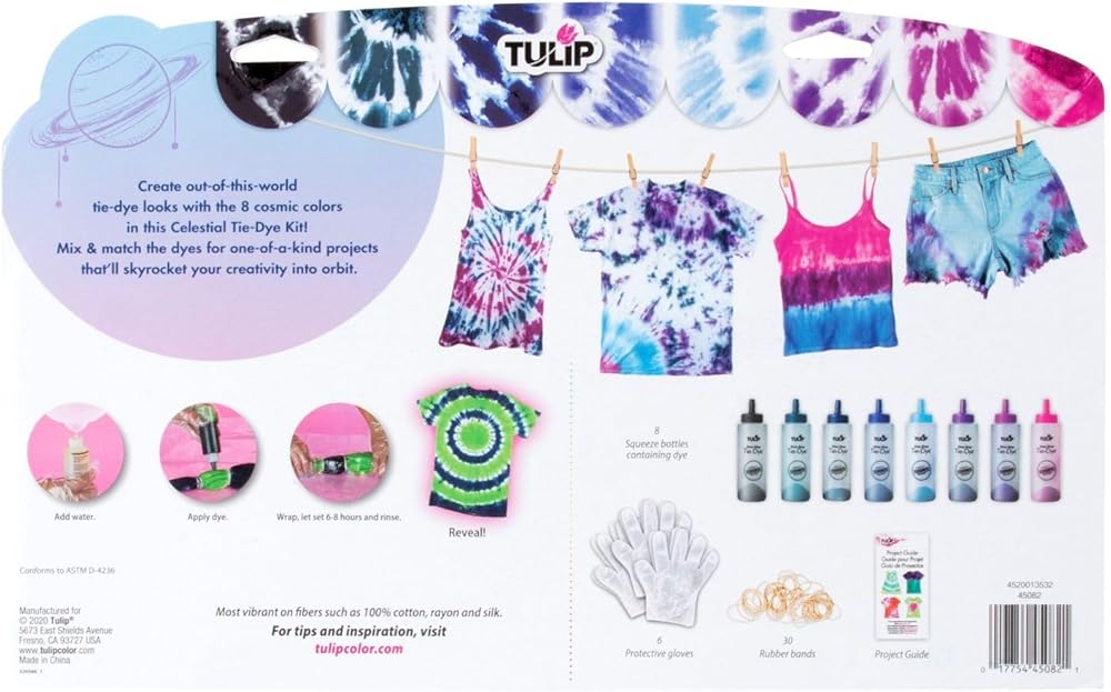 Create out-of-this-world tie-dye looks with the Tulip Celestial One-Step Tie-Dye Kit! Stocked with 8 colors in a fun cosmic palette: 8 dye bottles (Black, Aegean Sea, Blue, Royal Blue, Sky, Purple, Violet and Fuchsia), plus gloves, rubber bands, and an inspiration guide. This kit is ready to launch your creativity into orbit with colorful tie-dye looks you can mix & match. Dyes up to 12 projects. Makes a great gift too! Each bottle makes 2.75oz of liquid dye.