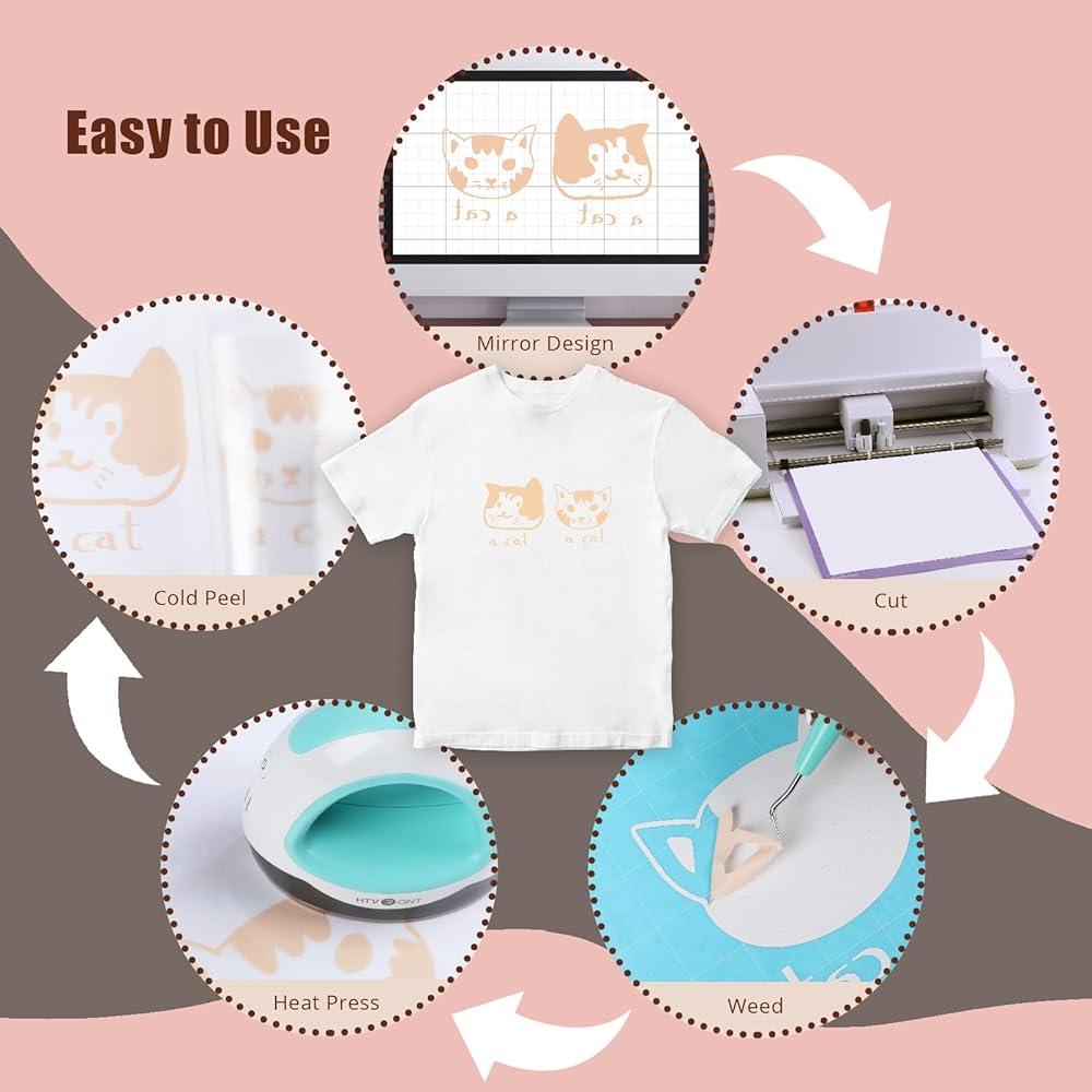 💎【CUT TO FIT YOUR DESIGN】Our white htv vinyl roll measure 12"x 60ft are easy and convenient to cut into different size of art designs or logos or letters and perfect for 12x12" and 12x24" cutting mats. HTVRONT heat transfer vinyl suitable for cutting machine and household iron.