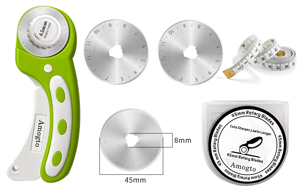 ✅【What's included in the product?】45mm Rotary Cutter*1, rotary cutter blades*1,2pcs extra replacement rotary cutter blades stored in a case, Soft measuring tape*1. If you have any questions, don't hesitate to reach out to our customer team. We offer a 30-day money-back guarantee. So go ahead and place your order – you've got nothing to lose!