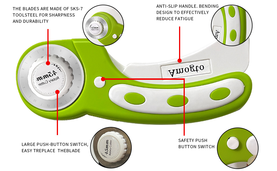 ✅【User-Friendly Design】The handle rolling cutter has an ergonomic handle that's been thoughtfully designed for comfort, with soft grips on both sides. It's non-slip and reduces strain on your joints. You can easily install the blade on either side of the rotary tool, making it a breeze for both right-handed and left-handed users to handle.