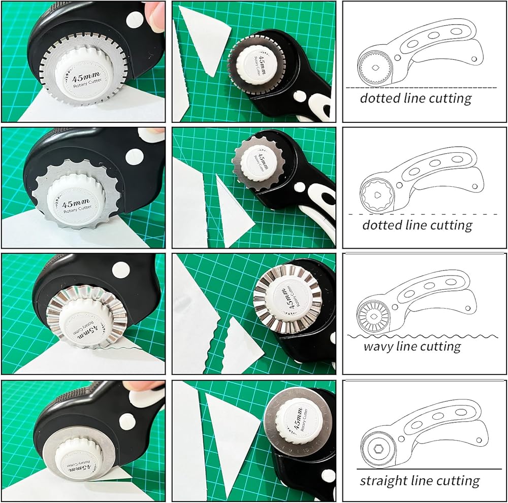 ✅【Versatile Rotary Cutter】The 45mm fabric rotary cutter is perfect for cutting multiple layers of fabric, including leather, wool, cotton, cloth, and carpets. Plus, this rotary cutter can handle things like cardboard, wallpaper, foam, and vinyl. It's a great tool for all your home, school, office, or shop sewing, crafting, scrapbooking, card-making, and other DIY projects!