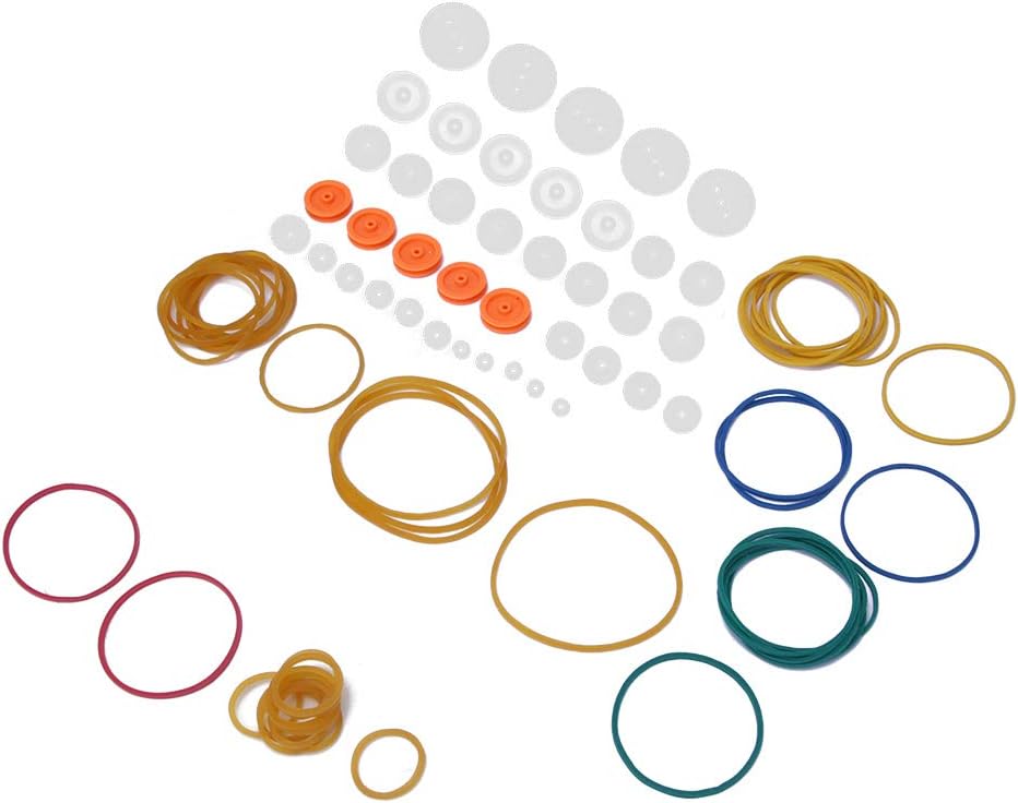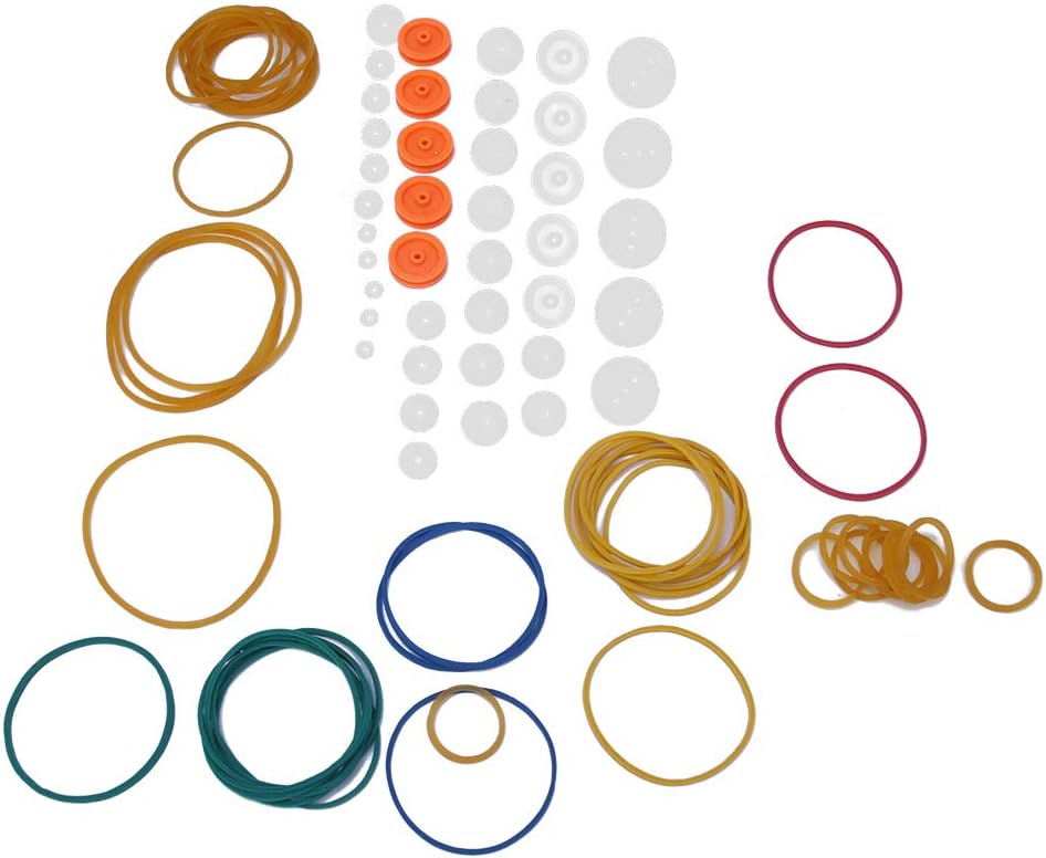 Drive Pulley Set: This pulley set includes 5 x pulley 62A, 5 x pulley 92A, 5 x pulley 132A, 5 x pulley 16.82A, 5 x pulley 102B, 5 x pulley 122B, 5 x pulley 182A, 5 x pulley 242A, 10 x Yellow Rubber Band 1.5x1.5x19mm, 10 x Yellow Rubber Band 1.5x1.5x28mm, 20 x Colored Rubber Band 1.5x1.5x40mm, 4 x Yellow Conveyor Belt CDD2x50mm.