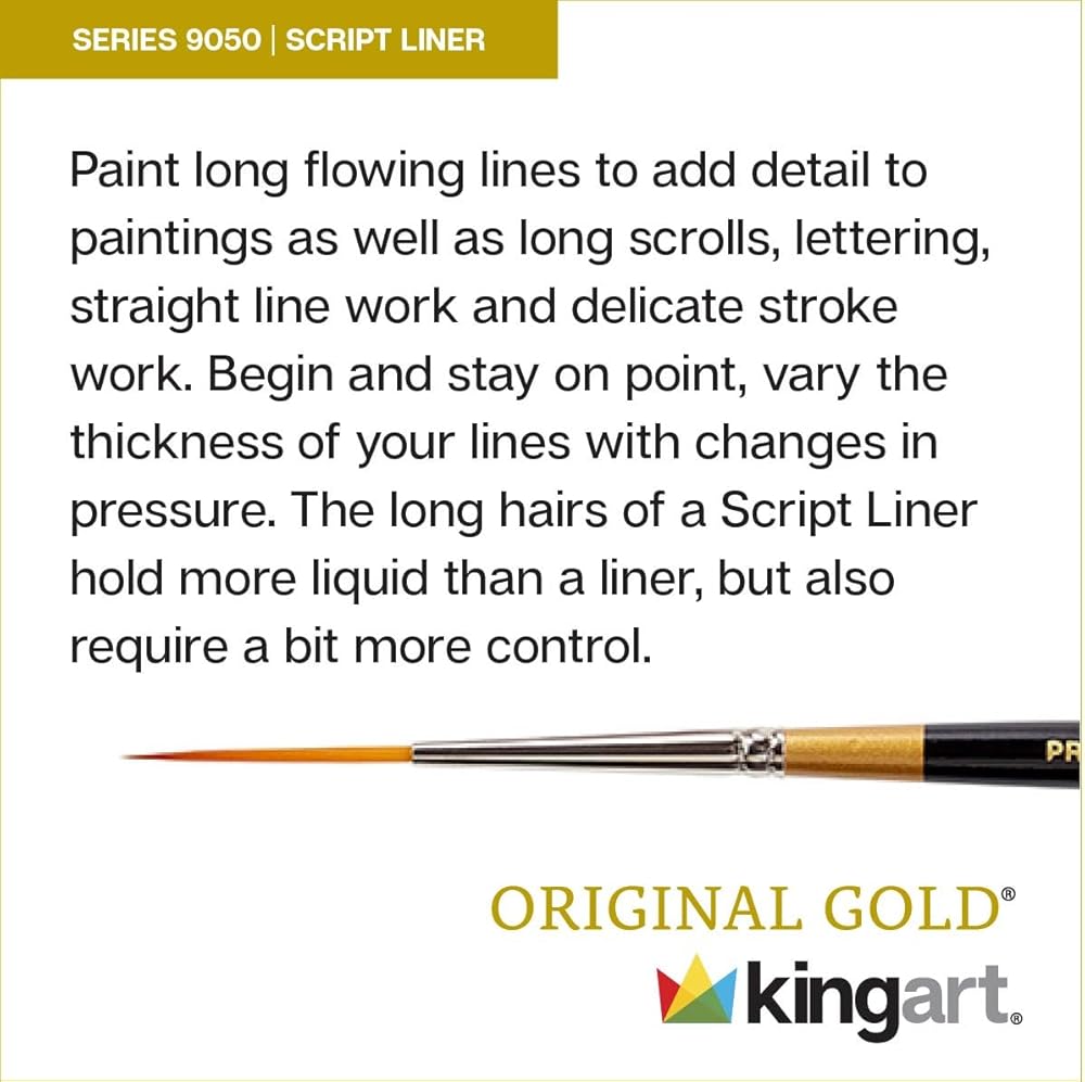Use KINGART Original Gold 9050 Series Script Liner brushes to paint continuous curved or straight lines. Thin paint to an ink-like consistency for easy application. These pointed, narrow Script Liners are useful for delicate lettering, outlining, long continuous strokes as well as highlighting.