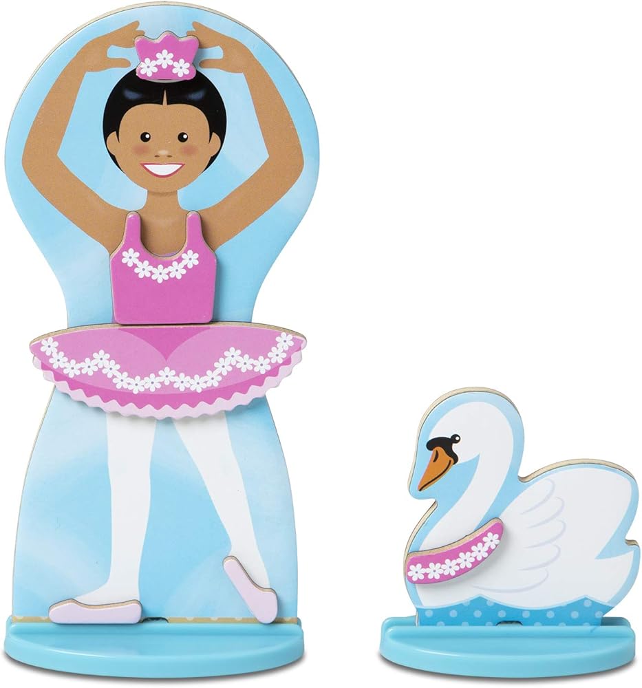 MAGNETIC DRESS-UP SET: The Melissa & Doug Mermaid & Dolphin Magnetic Dress-Up Set includes a double-sided wooden magnetic mermaid, wooden magnetic dolphin, 2 durable stands, 31 wooden magnetic clothing and accessory pieces, and an easy-to-carry storage tray.