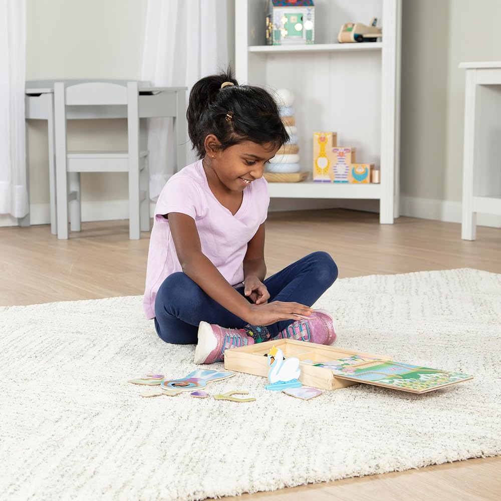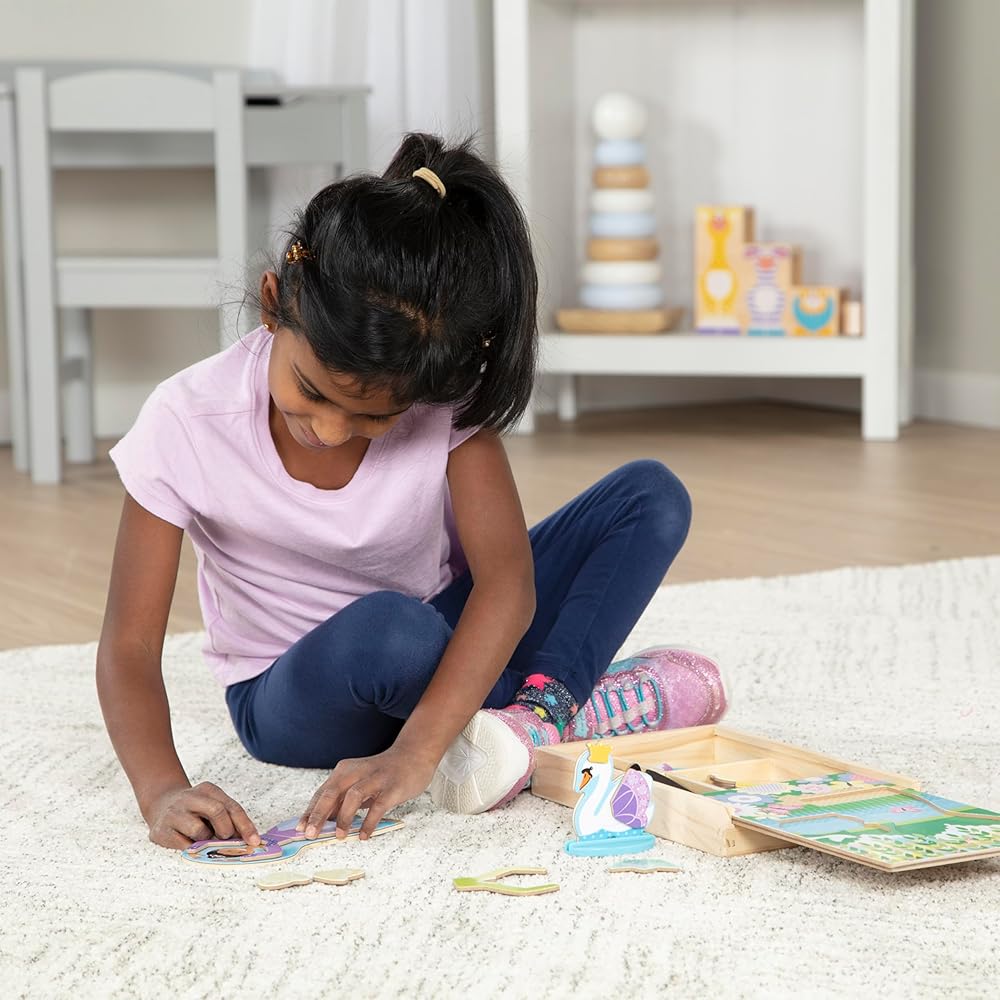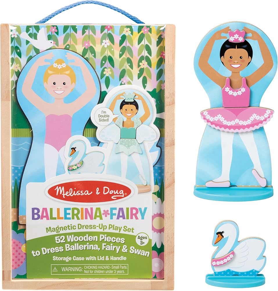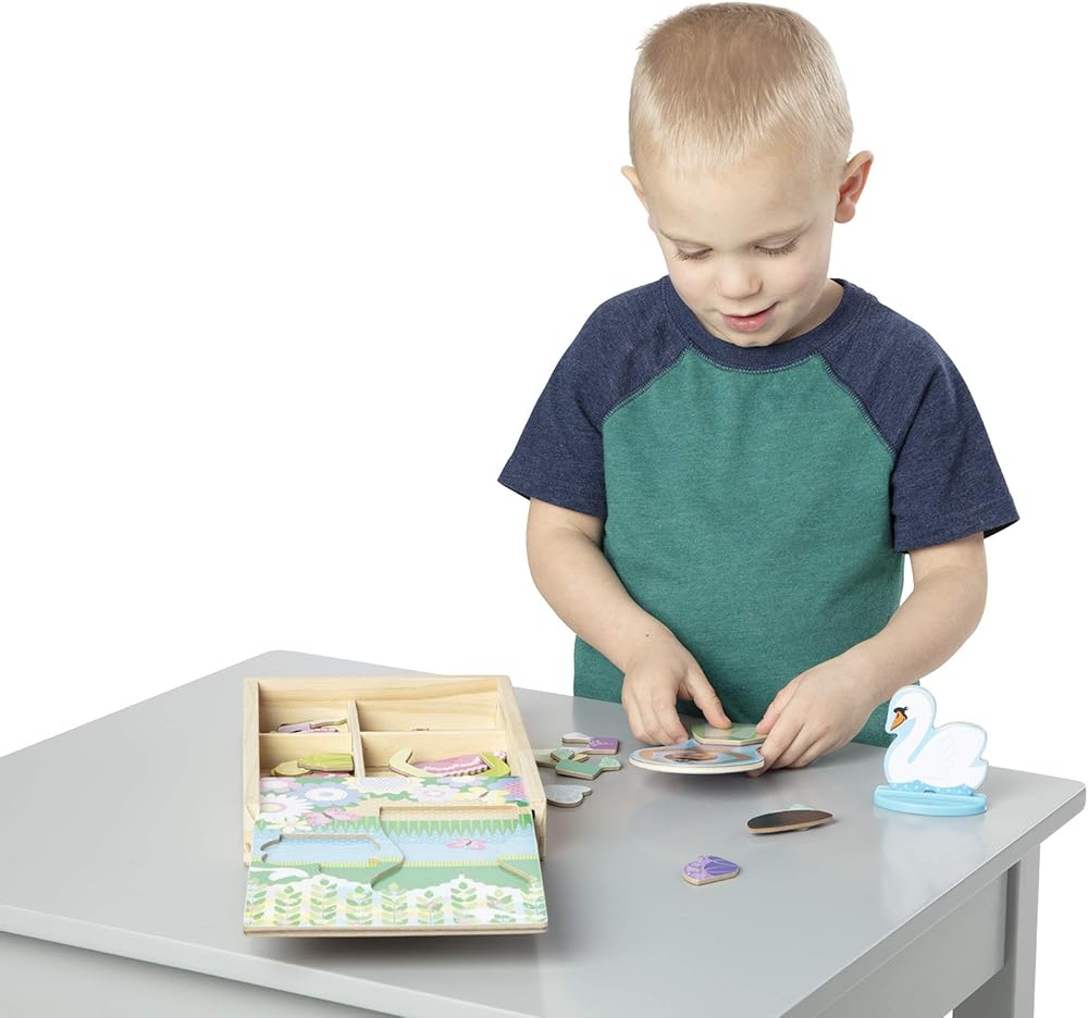 Combine dozens of magnetic wooden pieces in coordinating designs to dress a beautiful double-sided mermaid and her dolphin companion! The set includes 31 clothing and accessory pieces and durable stands for the mermaid and dolphin play figures, all of which store in a handy wooden take-along case with a slide-on lid and handle. Magnetic dress-up helps kids three and older develop fine motor, counting, and sorting skills, and encourages creative expression and imaginative play. For more than 30 years, Melissa & Doug has created beautifully designed imagination- and creativity-sparking products that NBC News called “the gold standard in early childhood play.” Today, Melissa & Doug is proudly partnering with the American Academy of Pediatrics to foster early brain development and help children build important life skills through play.