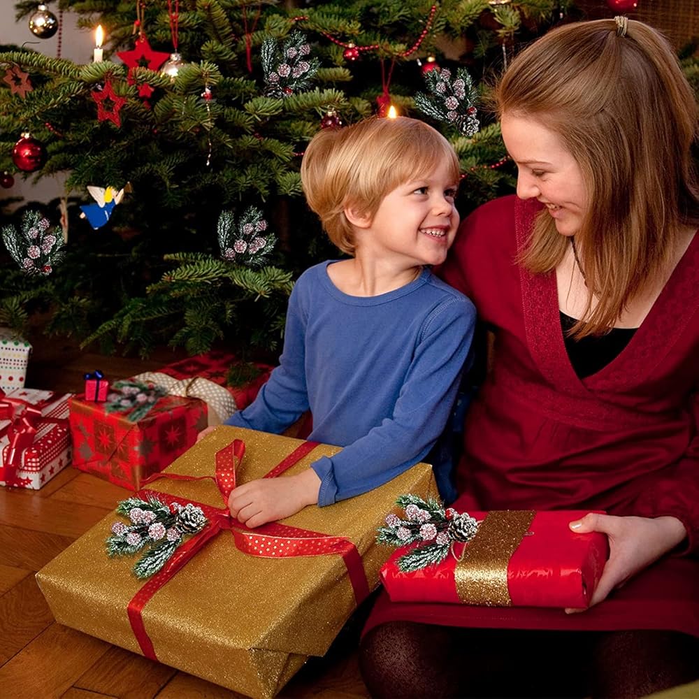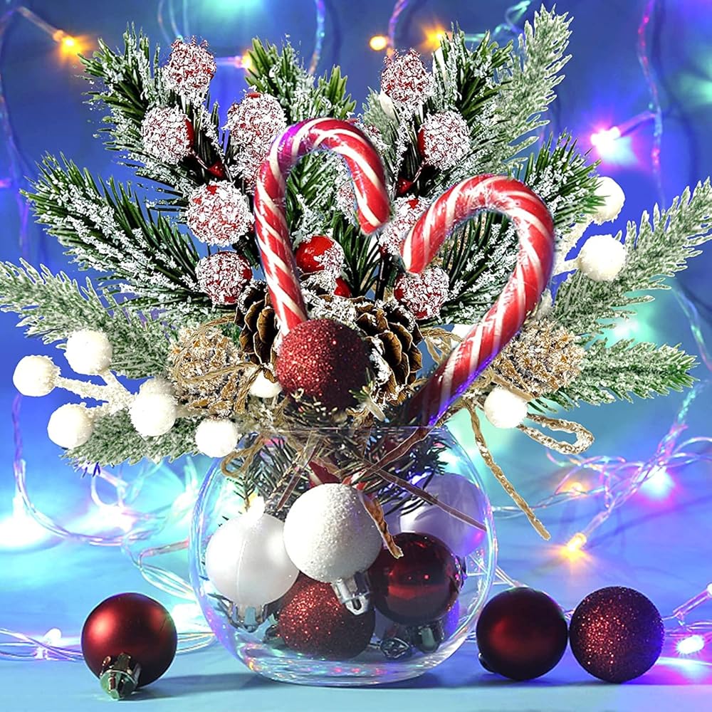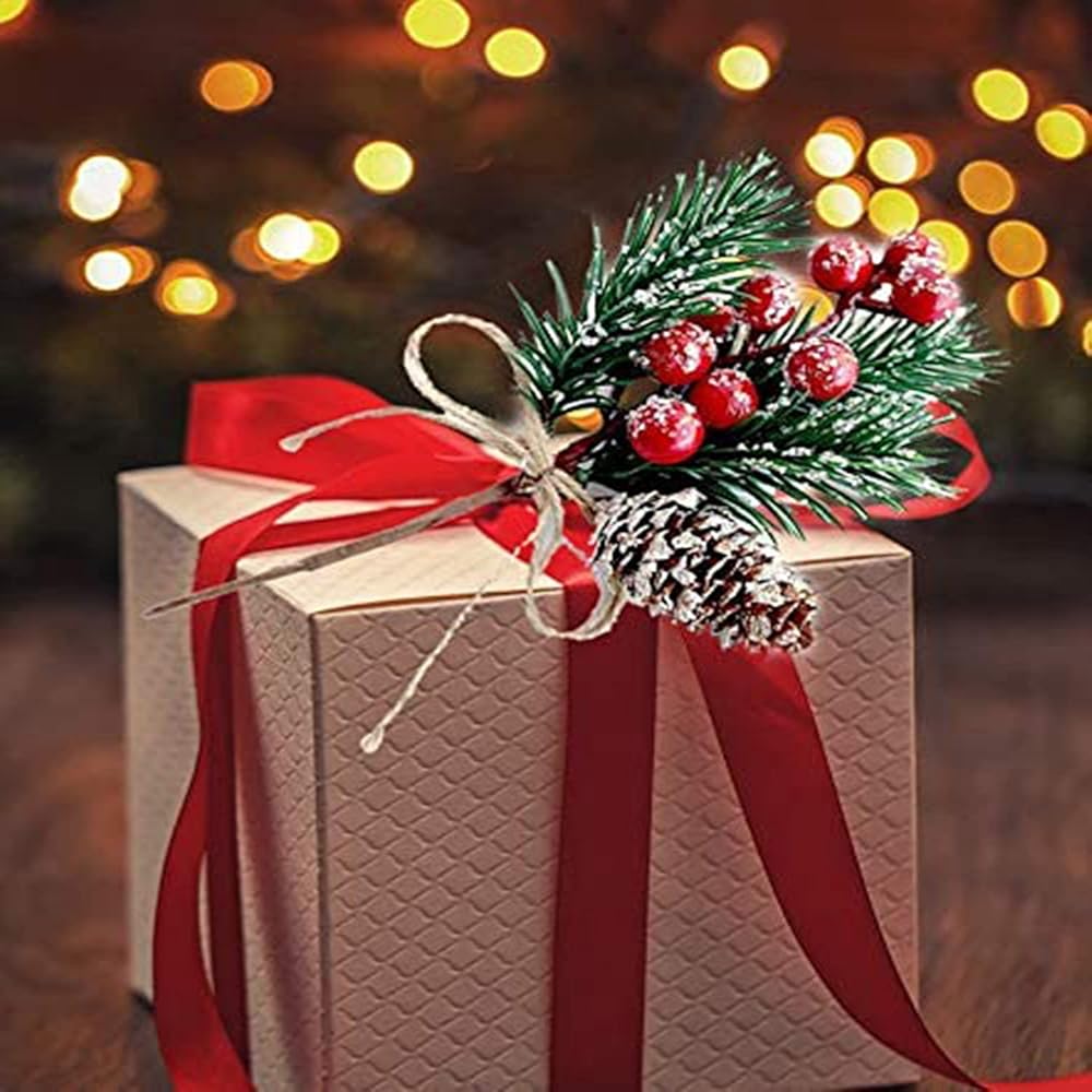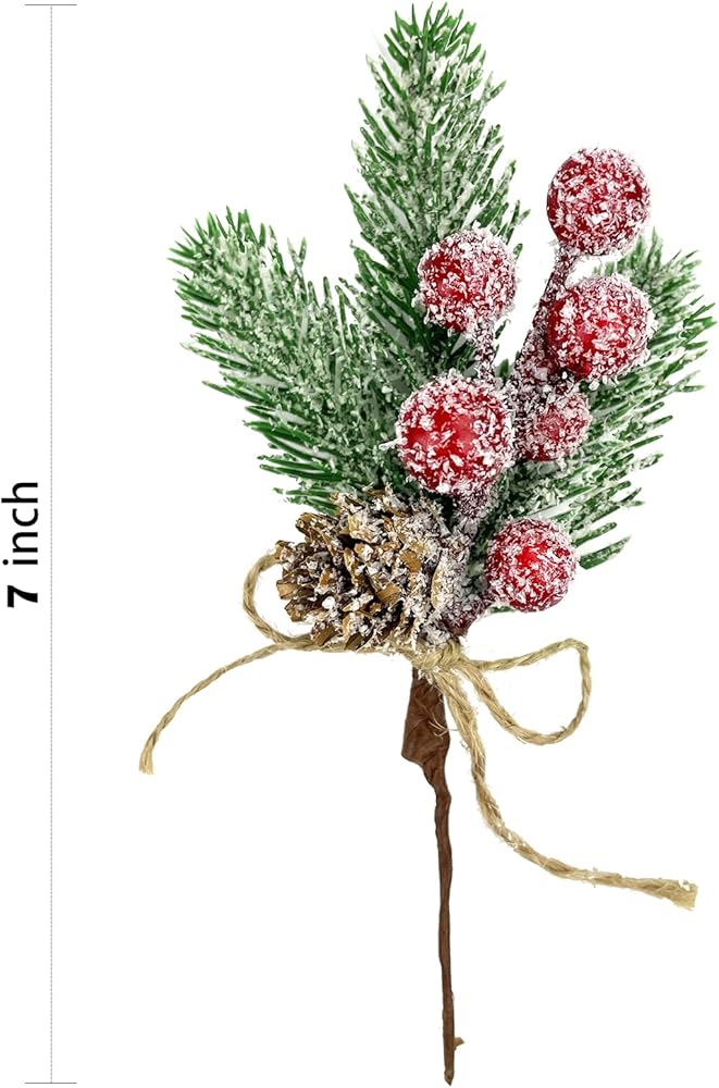 - These Christmas stems have a base of pine, holly leaves or green leaves, accented with a variety of holiday flair including red berries, snowy pinecones, natural - pinecones, red apples and burlap ribbon.