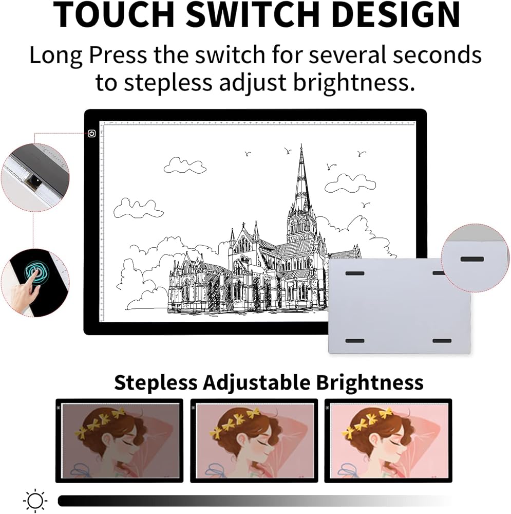 【 Stepless and 6 Levels Adjustable Brightness 】 0-100% stepless brightness control to meet your different needs. By shortly press to choose 6 levels brightness or by long press to suit your artwork in different environments. With 3000-6500K color temperature, it's bright enough to lit up through a few layers of paper evenly without glare. No longer to strain your eyes during tracing your drawing.