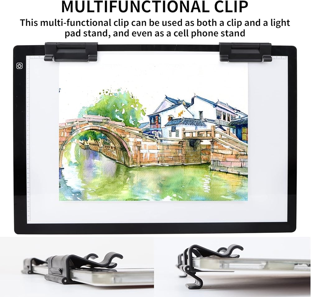 【 Innovative Stand and Stable Top Clip 】 The back side of the A4 light table comes with an INNOVATIVE bracket function is also convenient for you to adjust the angle of the copy board at anytime and anywhere. The Ultra-Thin tracing pad makes it portably, the fasten top clip is designed to hold paper & diamond painting canvas easily, also efficiently complete other projects without placing extra clips any more.