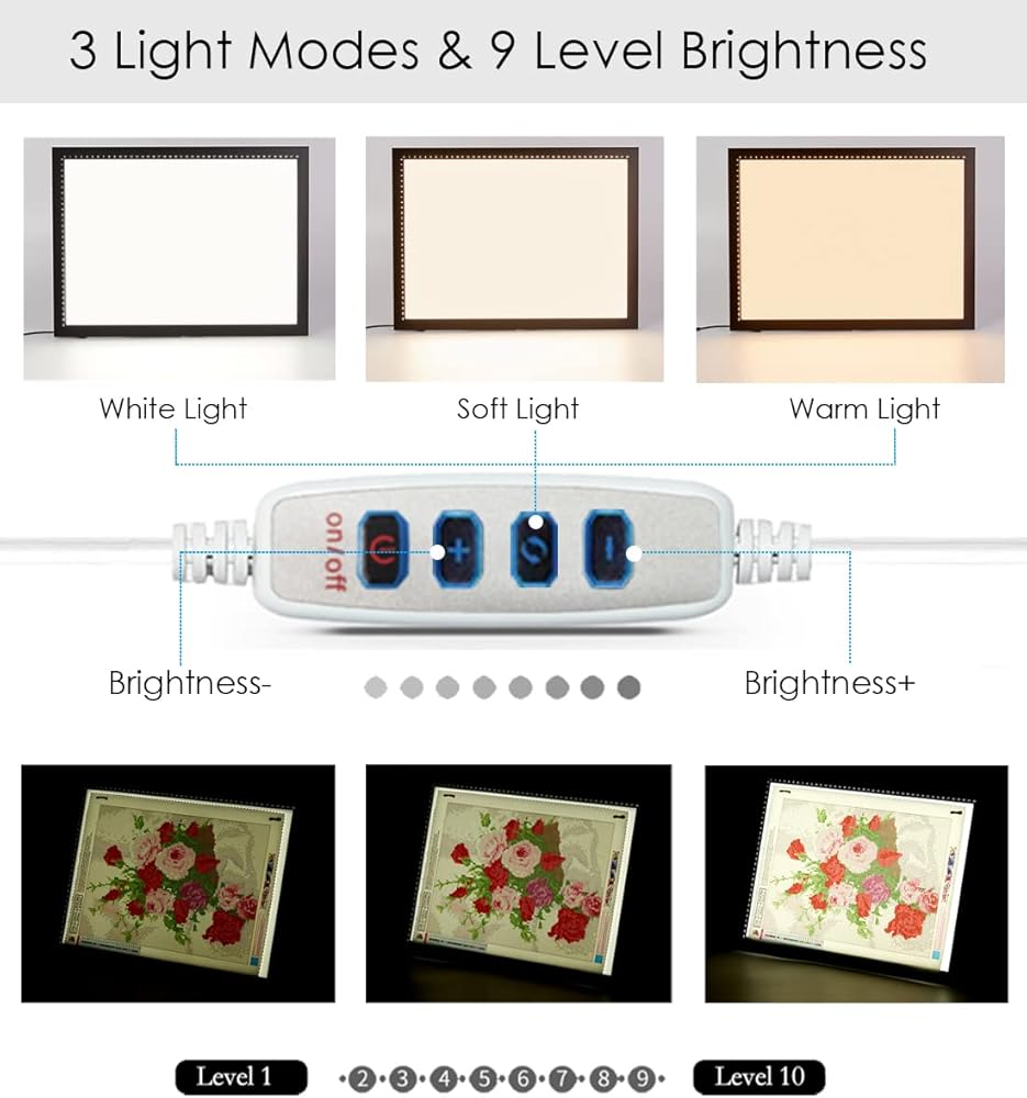 تصميم إعدادات الإضاءة بـ 3 ألوان: تحتوي لوحة الإضاءة هذه على 3 ألوان يمكنك تغييرها: الضوء الدافئ والضوء الأبيض والضوء الطبيعي. يمكنه حماية عينيك بشكل أفضل عند رسم صور مختلفة أو القيام بالرسم الماسي.