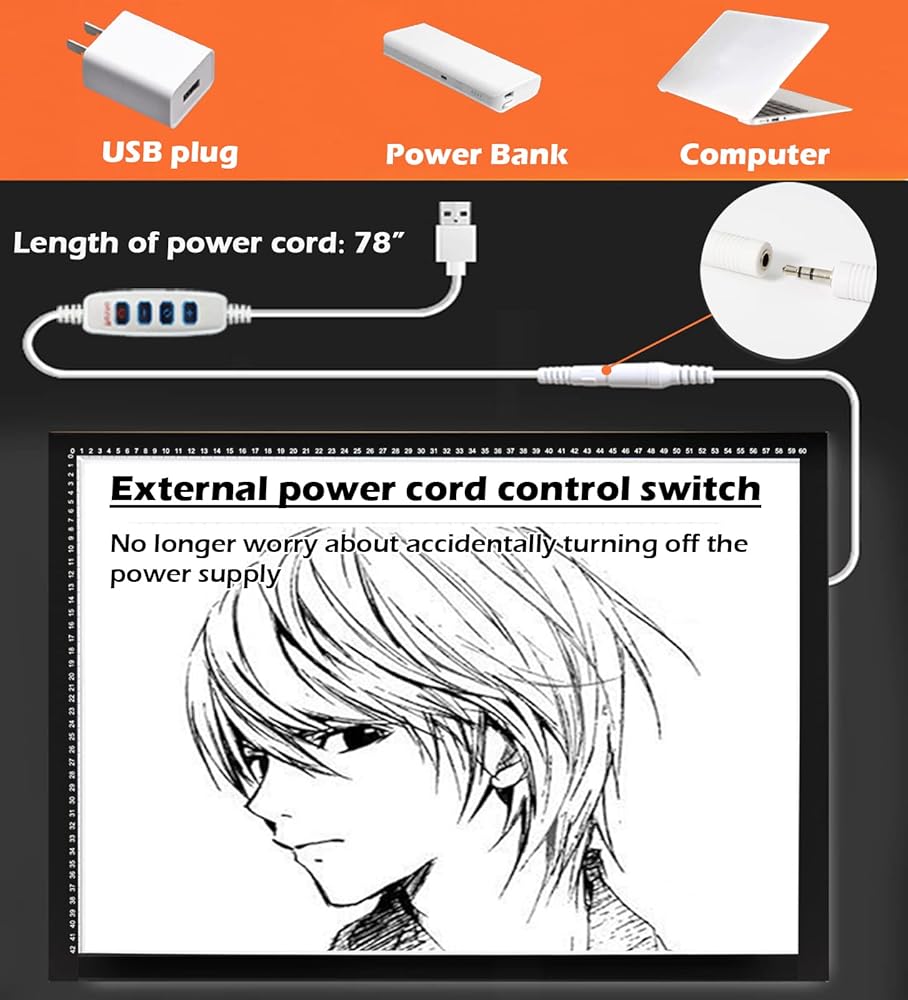 حجم كبير وتصميم سطح غير لامع: يمكن لهذه الوسادة المضيئة أن تغطي نطاق الورق من النوع A2 بالكامل. لن يحصل السطح غير اللامع للوحة الإضاءة هذه على أي بصمات أصابع، لذلك يكون من السهل تثبيت الرسم أو القماش على لوحة الإضاءة، ولا توجد نقاط وخطوط شبكية على السطح، لذا تكون الإضاءة متساوية تمامًا.