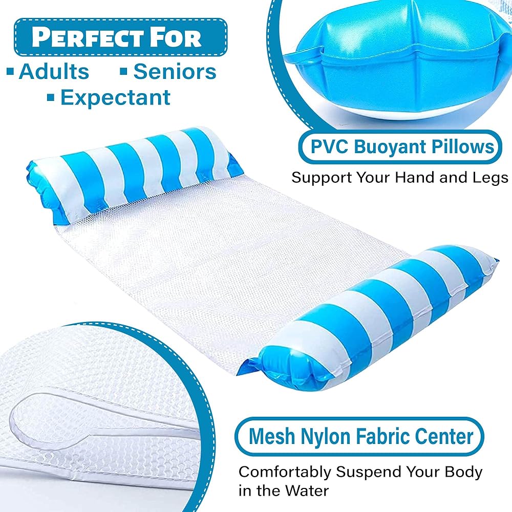 4-in-1 Mul-tifunctional Use】It can be used as a hammock, lounging chair, drifter or saddle, and have a lovely day relaxing, playing and exercise in the water.Planning to spend a day around the pool?Want to be more fun instead of laying on the float for a whole day?This Pool Hammock Floats is a perfect choice! Key Product Features
