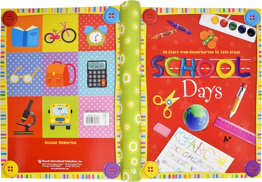This scrapbook is perfect to capture your child's special school-time memories from preschool to 12th grade. 34 pages - highlighted with colorful illustrations featuring poignant questions and information. Hardcover concealed spiral book measures 10" x 12.25". Printed on acid-free paper to preserve them for years. 14 generously sized pockets for preserving memories. Includes: Preschool, Kindergarten, First Grade, Second, Third, 4th, 5th, 6th, 7th, 8th, 9th, 10th, 11th and 12th Grade! Includes an area in each grade to place that special photo. Bonus: At the end of the book there's 3 sheets for placing up to 12 photos up to 5" x 7" each - ex. School Pictures, Graduation etc.