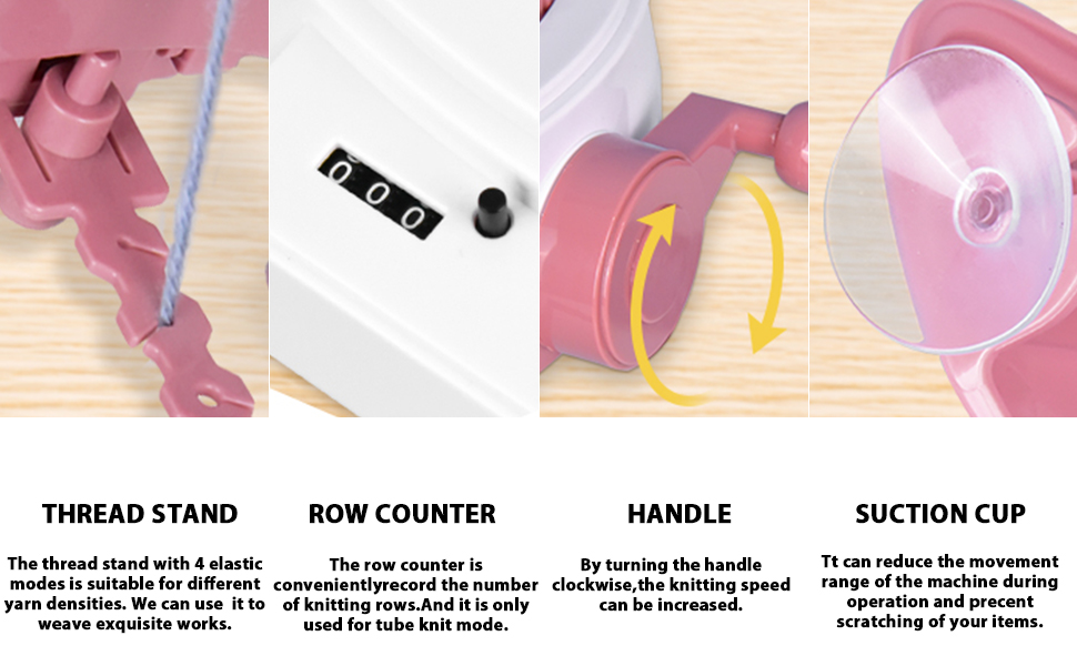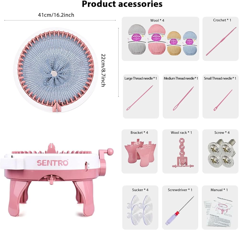 What you can get - 1 Knitting machine and very rich accessories, 3 Hand Needles, 1 Crochet Hook, 4 Yarns, 1 Screwdriver, 4 Suction Cups, 4 Screws, 4 Tripods, 1 Thread Stand and 1 User Manuals. If you are not satisfied with your product, please contact us directly, our customer service is always available.