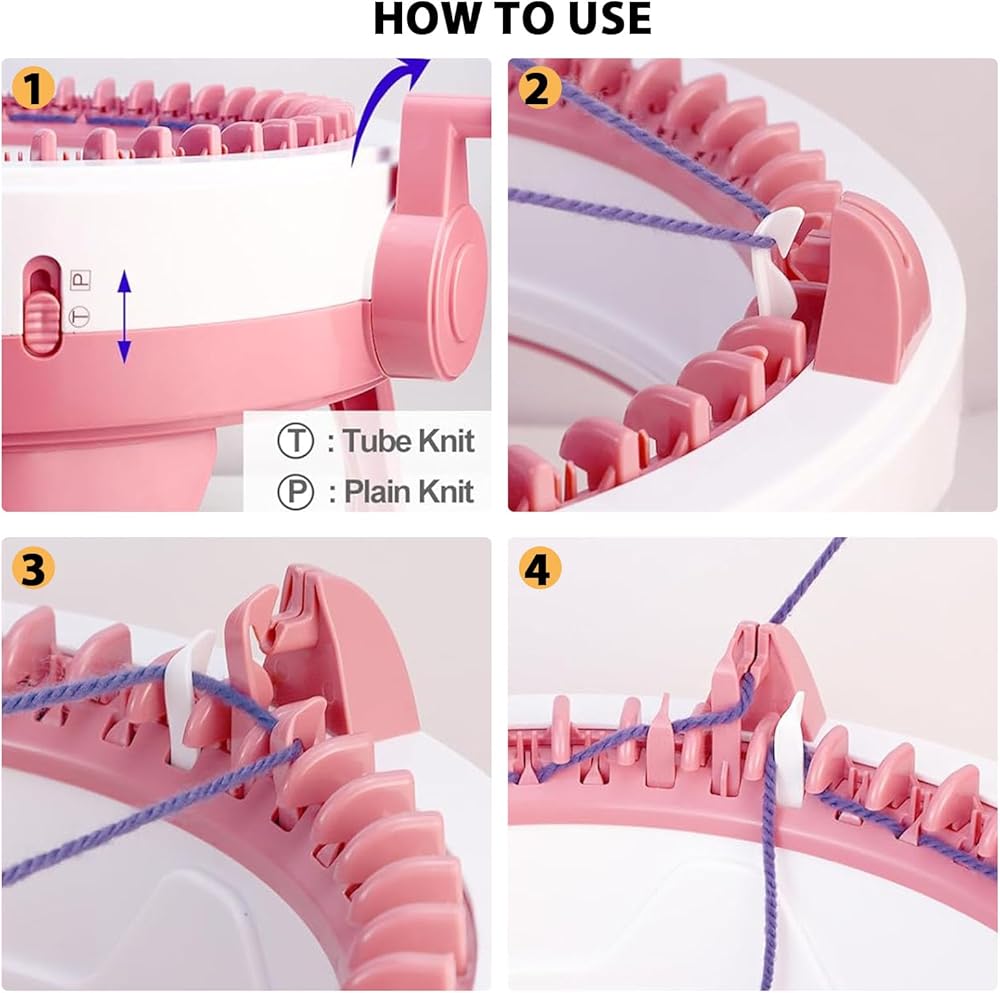 Two Knitting Modes - 1. P gear plain weave: plain weave to reduce needle sticks. Scarves, bags, sweaters, pillows, clothes, etc. can be knitted. 2. T gear ring weaving: circular weaving, fixed number of stitches! Hats, gloves, rag dolls, etc. can be knitted. The Knitting Machine is made of environmental and high quality plastic, which is odorless, safe and durable.