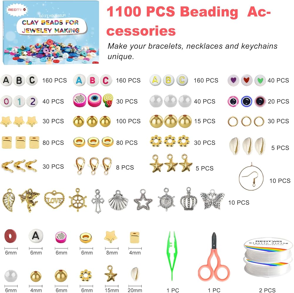PERFECT BRACELET MAKING SET: The bracelet making kit contains 14400 flat polymer clay beads and 1100 charm kits (letter beads, evil eye beads, heart beads, gold beads and earrings, etc.), 2 rolls of 10 meters stretchy strings, scissors, tweezers. This jewelry making kit is full of endless imaginative ideas for all beginners to make bracelets and jewelry!