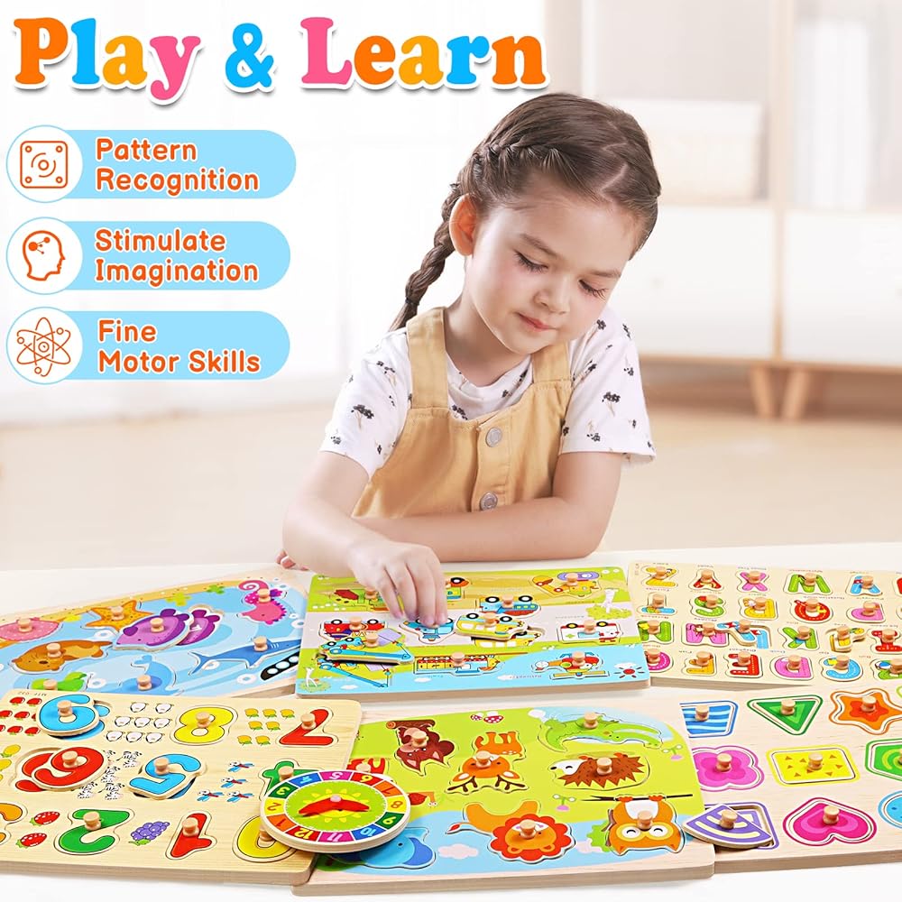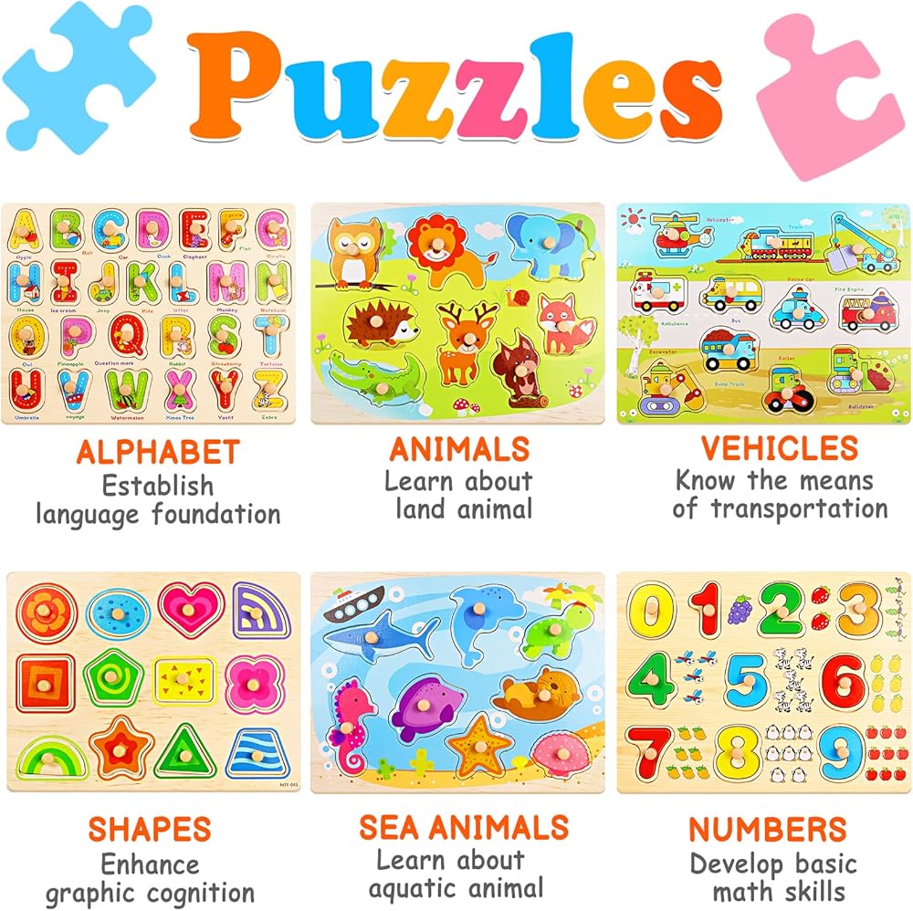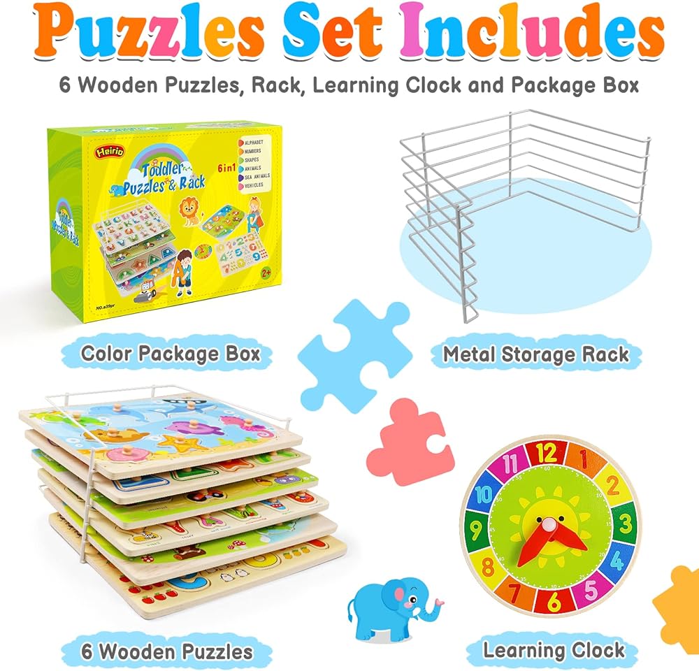 Puzzles for Kids Age 2-4 with Rack and Wooden Clock, 6 Pack Wooden Peg Puzzles for Toddlers with Storage Holder Rack, Educational Toys - Alphabet Number Animal Vehicle Shape