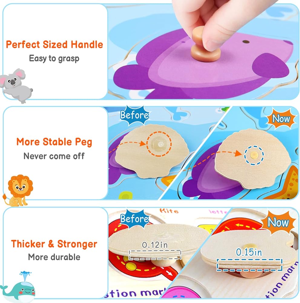 🧩【Easy To Grasp and Match】Pegs are perfect size for toddlers' little hands. There are pictures underneath the puzzle to help assist in matching the piece with the cutout, providing your child with hours of screen-free entertainment.