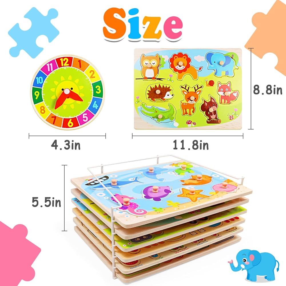🧩【Toddler Puzzles with Storage Rack】The Wooden Peg Puzzles Set comes with 6 engaging learning puzzles of different themes, 1 wooden learning clock and 1 metal puzzle holder for reaching easily and storage, keeping your playroom organized. Bright colors attract kids' attention.