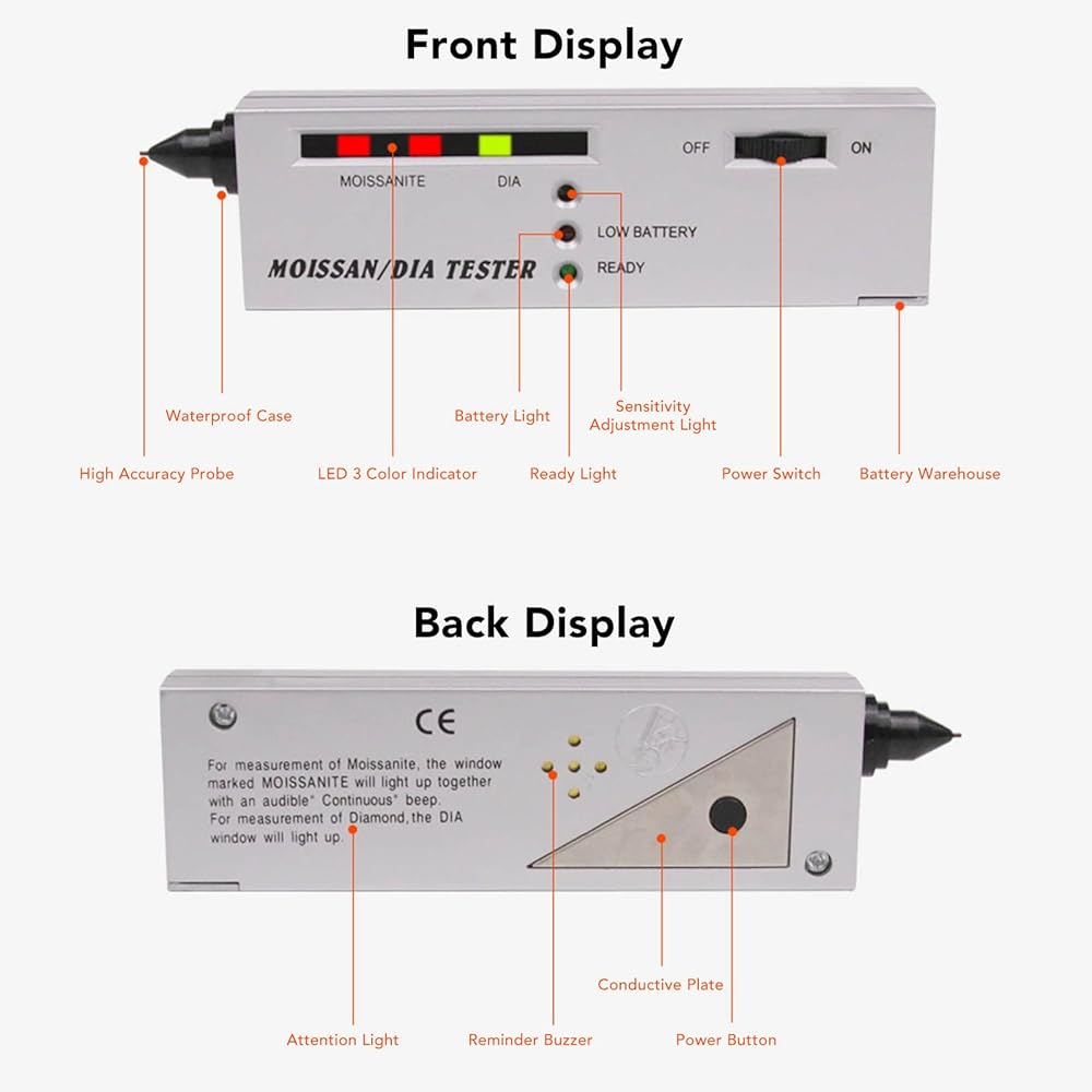 • SOUND ALARM: Sound alarm feature alerts users when a diamond or moissanite is detected, ensuring quick and precise identification of genuine gemstones. If a real diamond is detected, the green LED will light up, and if it is a moissanite or simulated diamond, the red LED will light up and give an alarm.