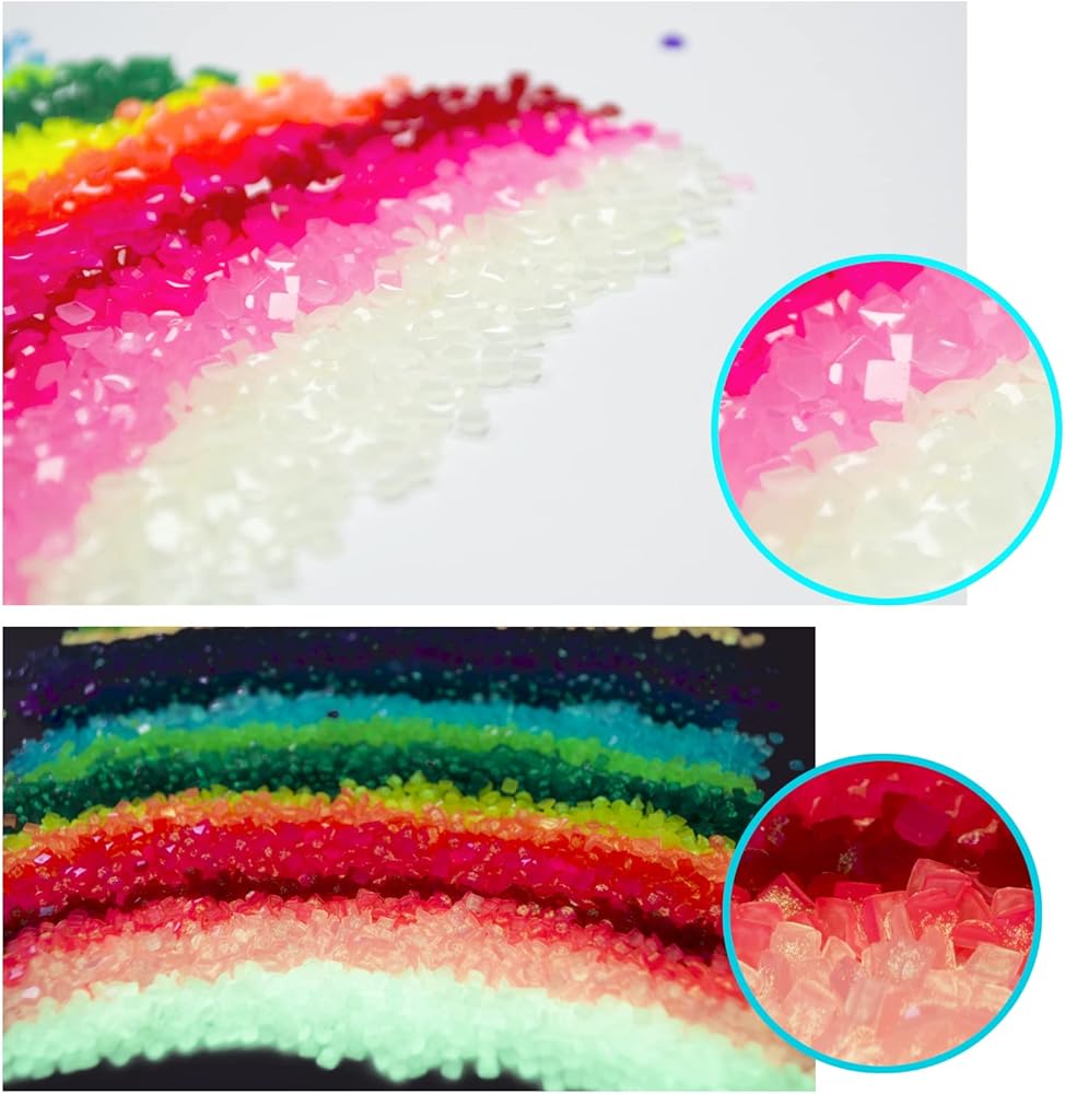 GLOW IN THE DARK: Glow in the dark diamond painting beads, which look like the jelly, it is a good choice for diamond bead art. Please illuminate these stones with strong light for about 5 minutes, they will glow in the dark. The bright light and long-time exposure lead to strong glows. Glowing diamonds add a touch of mystery to your decor and make it more sophisticated.