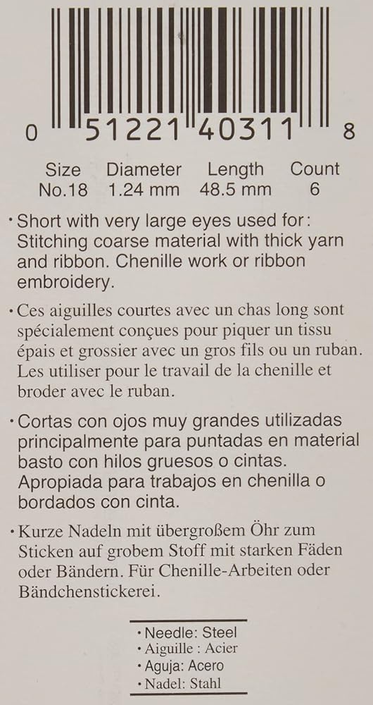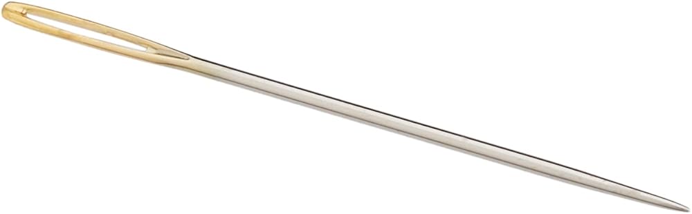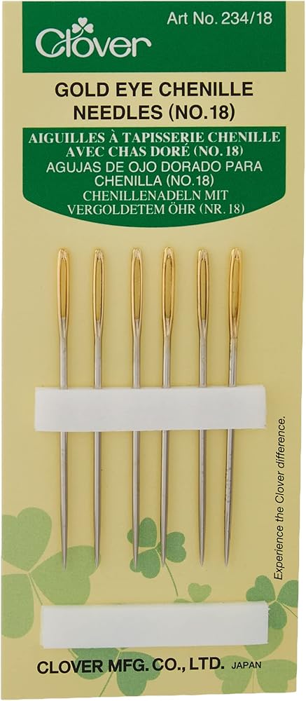 Clover-gold eye chenille needles. Sew with style! these short with very large eyes are used for stitching coarse material with thick yarn and ribbon. This package includes six needles with a Gold eye. Size: 24. Imported.