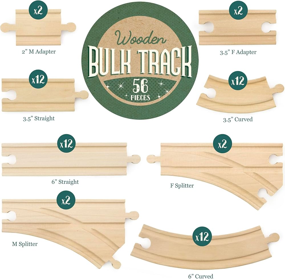 Join Conductor Carl and go full steam ahead toward endless track building possibilities! Put your child's imagination on the fast track with 56 premium quality train track pieces, compatible with all major brands of wooden train tracks. Watch as your child creates and explores by moving their train cars around their own railway worlds. With so many ways to mix and match, there's no limit to the combinations of where their tracks can lead. Your child will be chugging right along the rails for hours! This set includes: