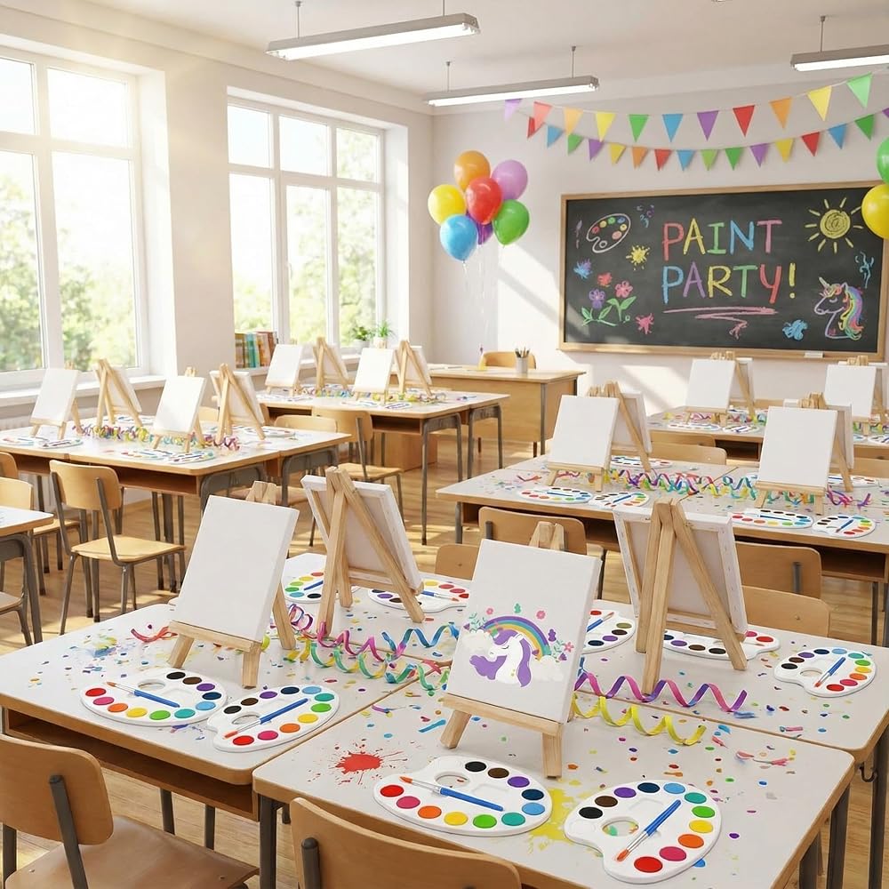 Pack of 12 Paint Sets: each package includes 12 pcs watercolor paint sets, come with 12 painting canvas panel with mini wooden easel sets; Every set has a paint palette with 12 color shades and a mini paintbrush; This cool paints pack will bring out the creativity from your kids