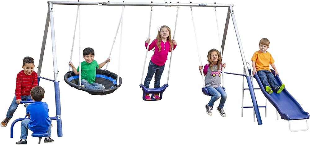 The Free N' Swing Set is part of the Galvanized Steel Frame Line up from XDP Recreation. Galvanized Steel for Strength, Safety and Durability. Galvanized is a Protective layer of Zinc on the Steel Tube that requires no maintenance, rust free, for many years. The Free N' Swing - Swing Set is a 5 station, 4 leg frame swing set that accommodates up to 7 kids. It includes 1ea-Swing, 1ea-Stand-R-Swing, 1ea-Super Disc Swing, 1ea-See-Saw, and 1ea-5' Wave Slide. Also included are Foam Frame Leg Pads for Safety. The frame legs are 2” diameter x 20-gauge wall thickness, top bar is 2” diameter x 20-gauge thickness. Our Adjustable Height Chains have Safe-Touch PVC Chain Covers on the Blow Molded Swing Seats for no pinch.The Swing seat accommodates one rider, the See-Saw two riders, the Super Disc Swing seats two riders and the Stand-R-Swing allows one rider to sit and swing or stand swing. The Wave Slide has handrails and a ‘safe landing' for safe-stop entrance to ground. One user at a time is recommended on the Wave Slide. Galvanized Grey Frame Color, Blue seats, a blue See-Saw, a Blue Super Disc, a Blue Wave Slide and blue foam frame leg padding. Up to 7 Kids can play on the Free N' Swing - Swing Set at once with a 100lbs per seat/play maximum. Designed and engineered for Parents ‘safe and fun' thoughts for their Kids. XDP's Galvanized steel frames have welded (no bolts) corner brackets for superior stability and ease of assembly. All seats, riders and handles are made of a durable blow molded polyethylene (HDPE) material. The one-piece Wave Slides are HDPE (High Density Polyethylene) blow molded.The blow molded components provide additional quality, value and performance to the XDP Recreation products.