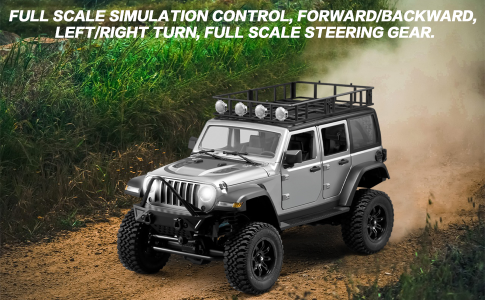 • RC Jeep Crawler: All-round simulation control, forward/backward, left/right turn, full-scale steering gear and proportional control. Upgraded alloy material, anti-wear and fall; Simulated rubber vacuum tires with stronger grip and friction resistance. This car is suitable for various terrains such as sand, grass, rocks, muddy roads and so on.