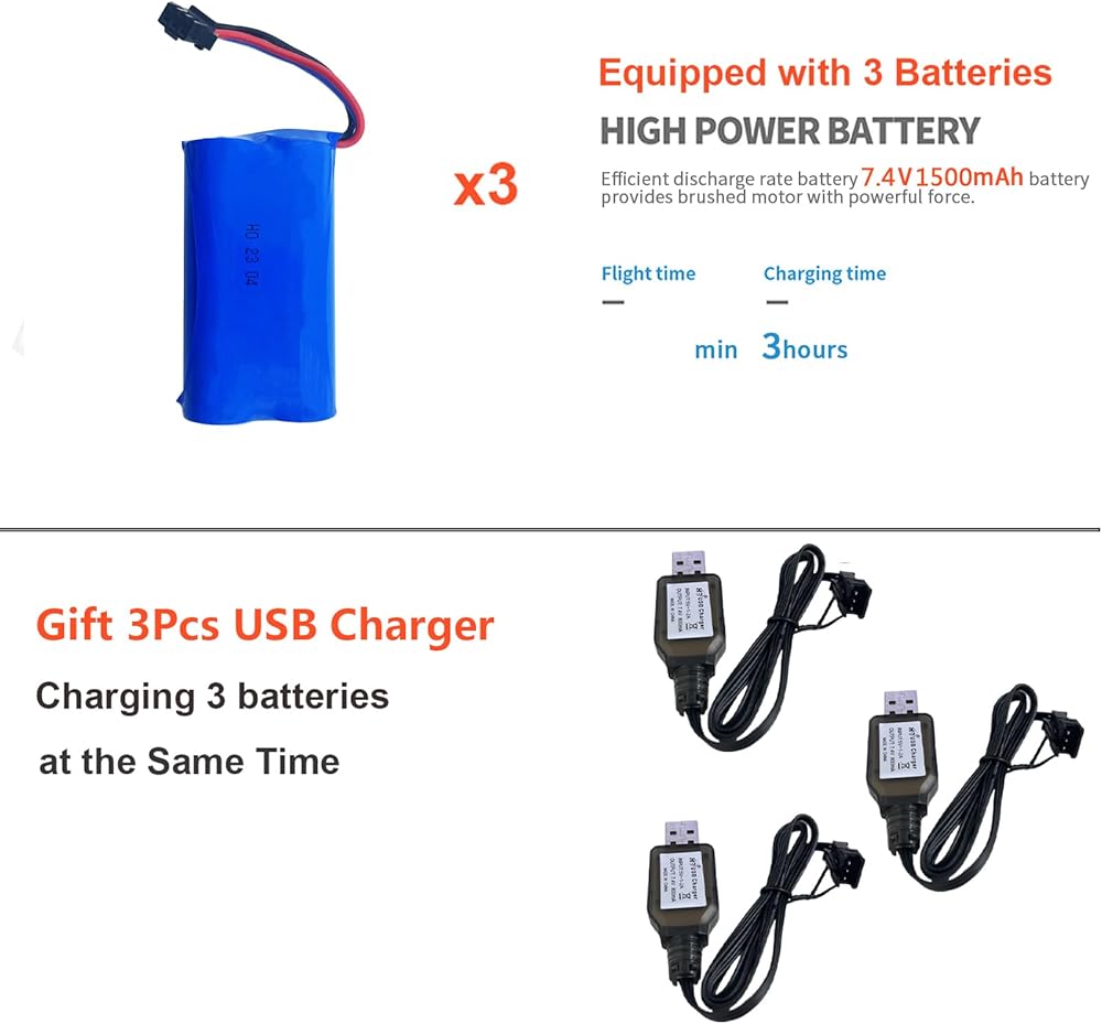 • 3Pcs Upgrade 1500mah Battery: The mn128 rc crawler with 7.4V battery provides the running time up to 20~25 minutes per battery, allow you to experience a longer and uninterrupted gaming time. 3 hours of full charge are required. And gift 3pcs USB charging cable come with the rc car which can charging 3 batteriesat the same time.