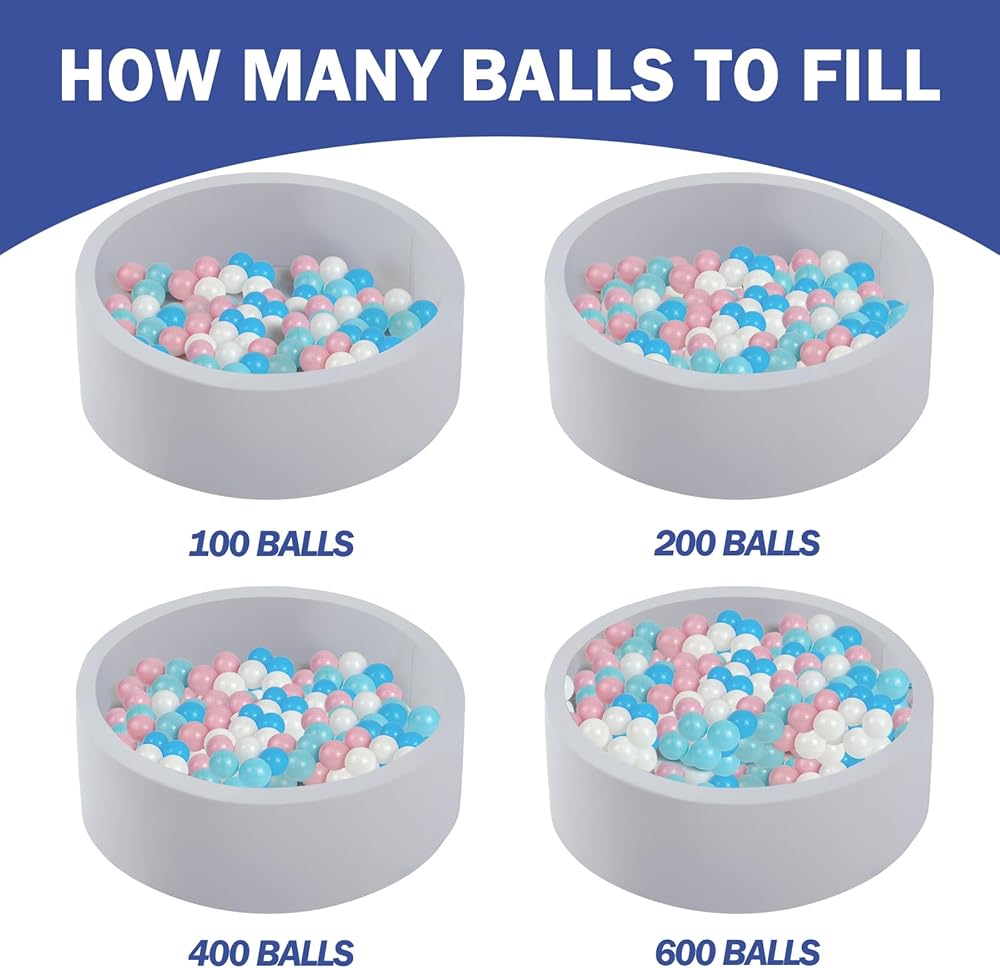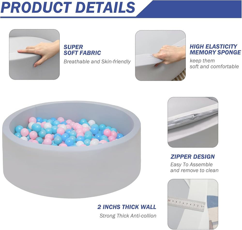 【Safe & High Quality Ball Pit】The baby ball pit uses 2 inches of safe and high-quality soft memory foam as support. The surface is made of baby-friendly high-quality skin-friendly fabric. It is a safe and comfortable baby ball pit, keep your children safe to play, jump and explore.