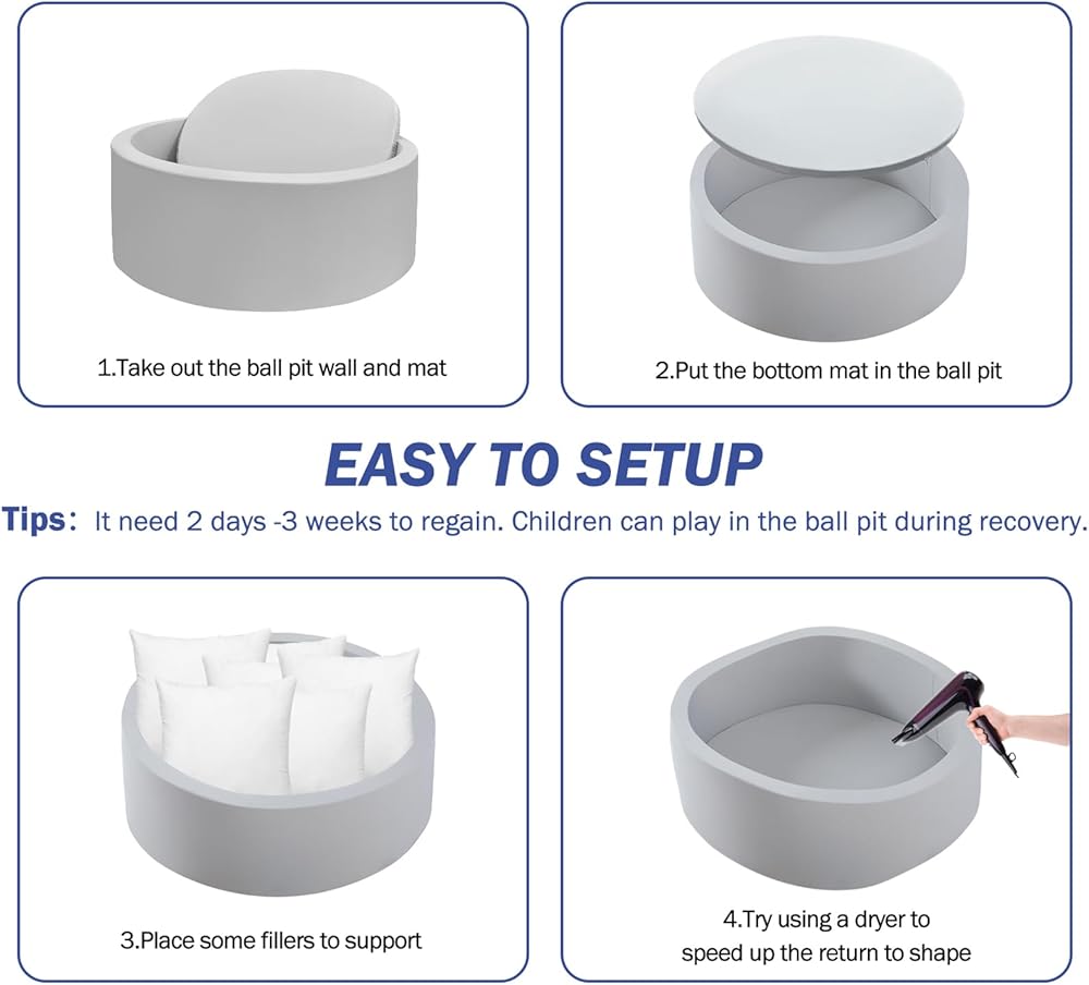 【Vacuum Sealed Packaging】Ball pit for babies is vacuum-sealed to avoid damage in transit. After opening the package, the ball pit will automatically bounce back to its original shape. Please leave it for 2 days - 3 weeks and it will take shape gradually. If the ball pit does not recover, just use the cold air mode of the hair dryer to easily restore it. Not affect the use when taking shape.