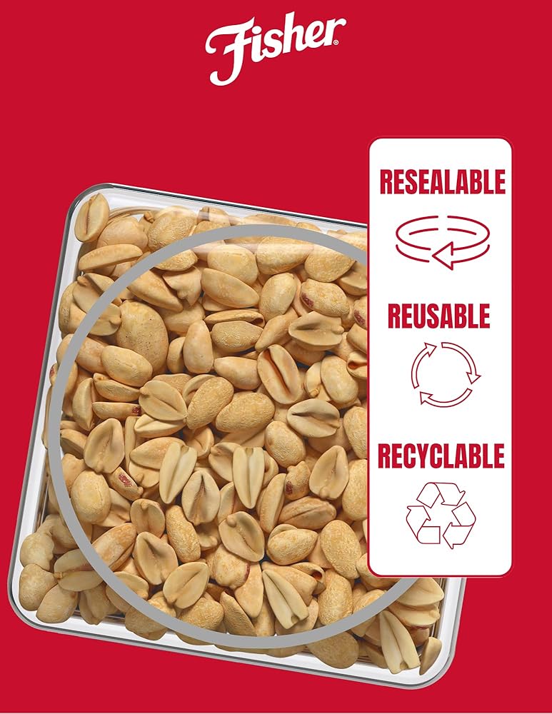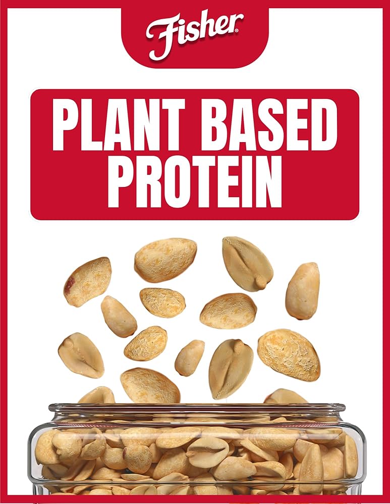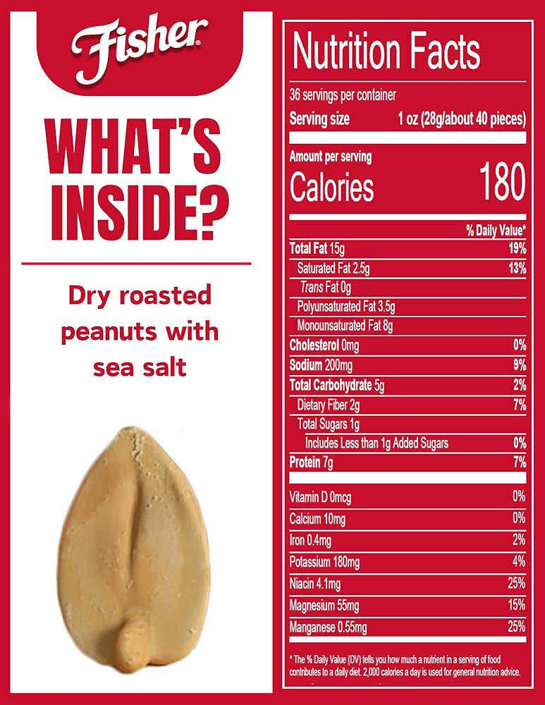 It's a Fisher favorite. Fisher Sea Salt Dry Roasted peanuts starts with premium peanuts, then we salt and roast them to bring out the delicious crunch that everyone loves. Fisher Snack nuts are packed with wholesome goodness, rich flavor and that signature crunch you crave. Our classic, clear jar highlights the unsurpassed quality of Fisher nuts which are sourced directly from farmers, many of whom we've worked with for generations. Peanuts contain more protein than any other legume or nut. This is especially important for children, vegetarians and people who seek extra protein in their diets. Peanuts contain mostly beneficial monounsaturated and polyunsaturated fats. These fats as compared to saturated fats have been shown to help lower blood cholesterol levels. Fisher is your home for a complete assortment of snack nuts, nut mixes, trail mixes and salad toppings, as well as an extensive variety of baking and cooking nuts.