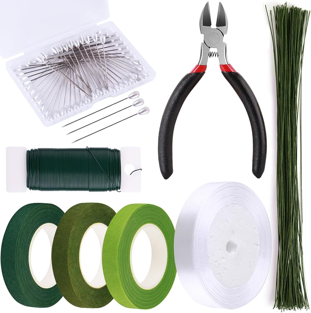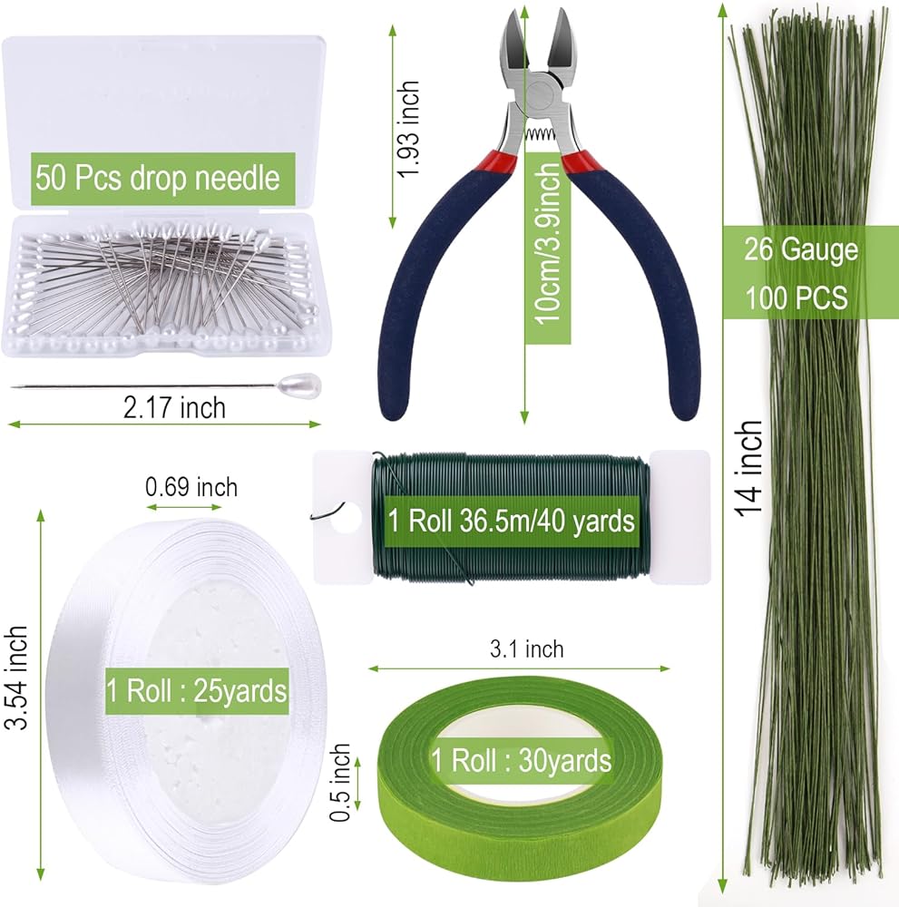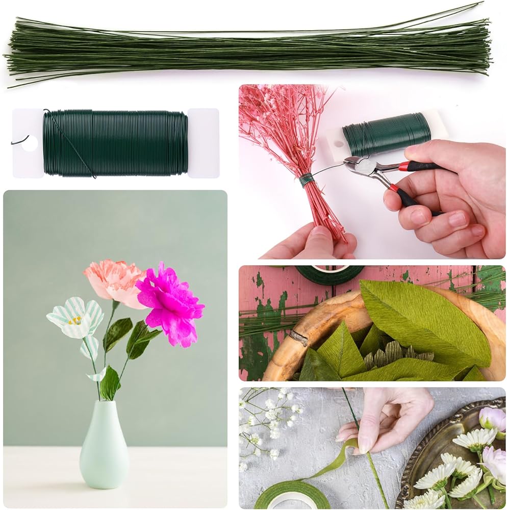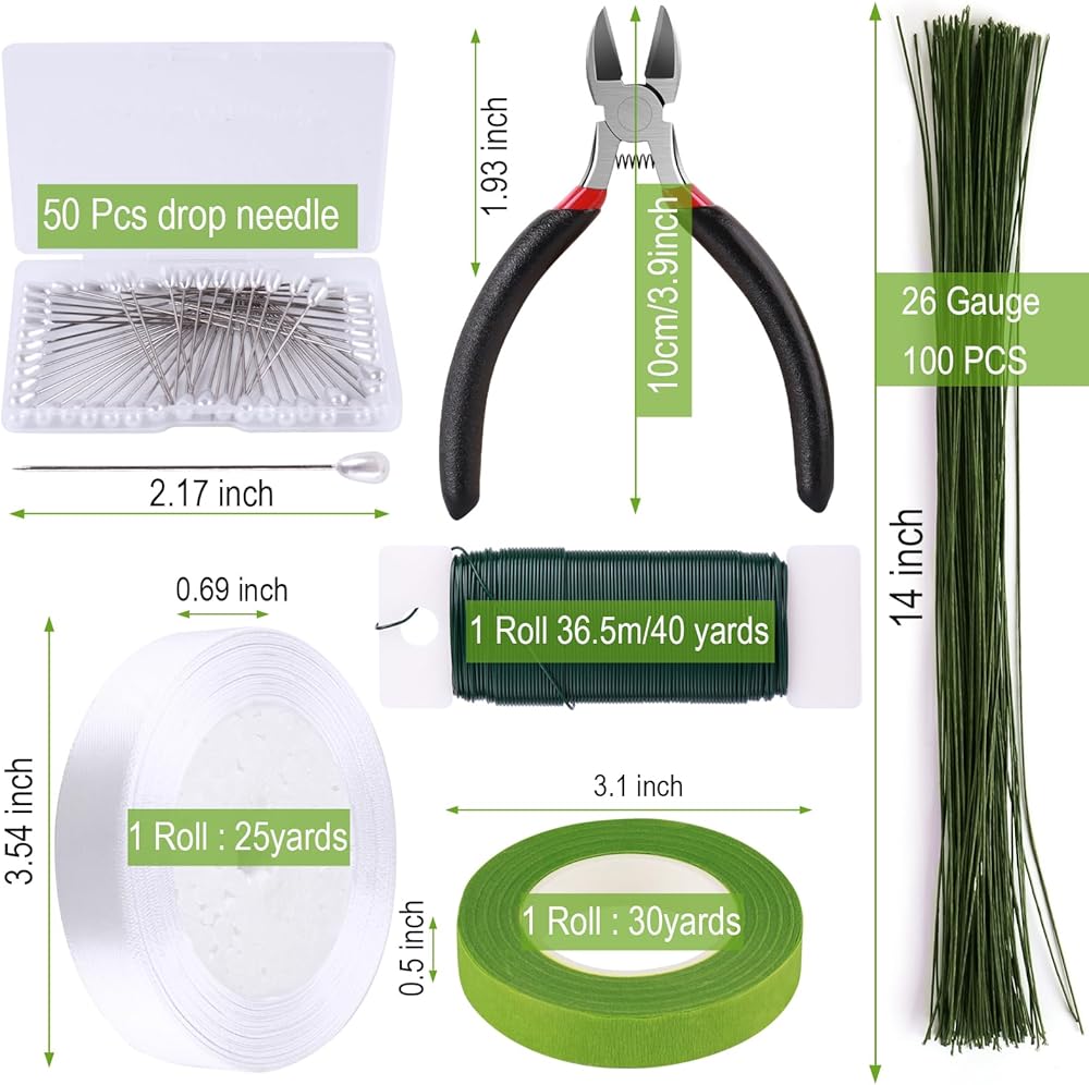 【Floral Arrangement Kit】 – 100 pieces of green stem wire 26 gauge, 115 feet of green paddle wire 22 gauge, 3 rolls of green floral tape, 2 rolls of white floral vase Tape, and 1 pair of wire cutter. These wreath-making supplies are all you need for DIY flower arrangements, bouquets, boutonnieres, etc.
