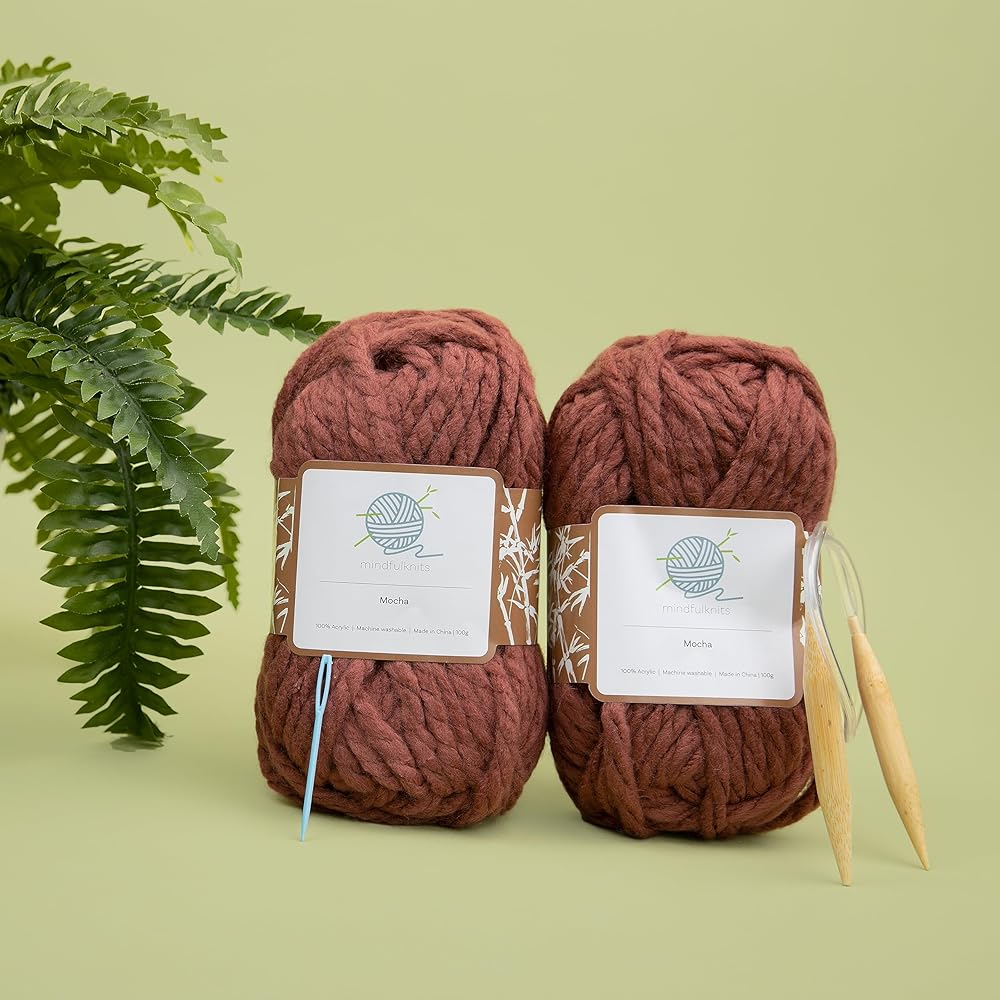 mindfulknits Learn to Knit Kit - Knit a Chunky Beanie- Knitting Needles, Yarn Needle & Acrylic Chunky Bulky Knitting Yarn– Mocha- Beginner Kit for Relaxation & Stress Relief