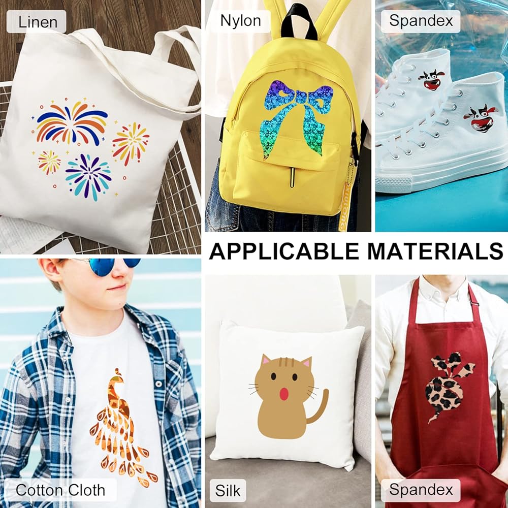 ECO & USING WIDELY: 12" × 10" pre-cut size Iron on Vinyl Bundle is suitable for use with most popular cutter machines and cutting mat. Our quality HTV Vinyl Bundle can be used to create stunning projects on a wide variety of fabrics such as including 100% Cotton, Cotton/Polyester Blends and even Athletic Mesh fabrics! Personalize your custom t-shirts, tote bags, caps, aprons, pillows and more with our Vinyl HTV!Our materials are SGS certified eco-friendly and are safe to wear
