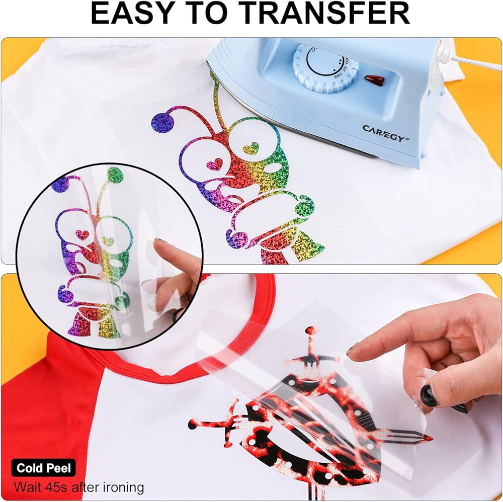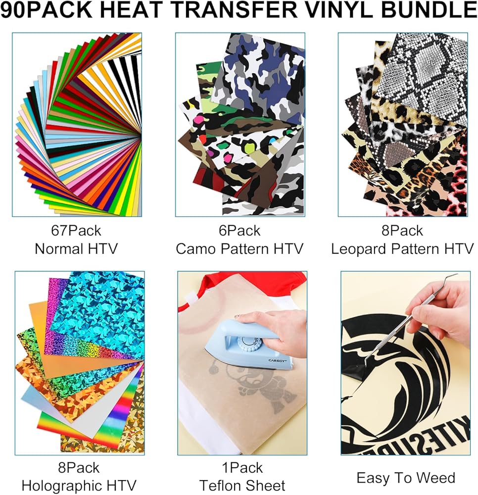ASSORTED COLORS & UNIQUE MATERIAL HTV: The heat transfer vinyl includes 53 vivid colors with custom SIZE 12" x 10". Our iron on vinyl includes not only 31 of the most popular matte colors, but also include 14 of the most popular Camouflage and LeopardPrint htv colors, 8 of the most popular Holographic htv colors,1 pc teflon sheet for htv vinyl project