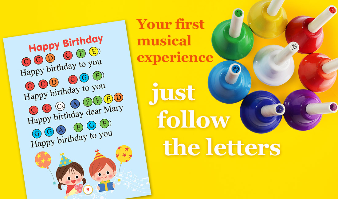 🔔 8 tuned metal handheld bells for kids and adults are ranged from middle C to high C full octave. All hand bells are color coded and marked with a corresponding note on handles.