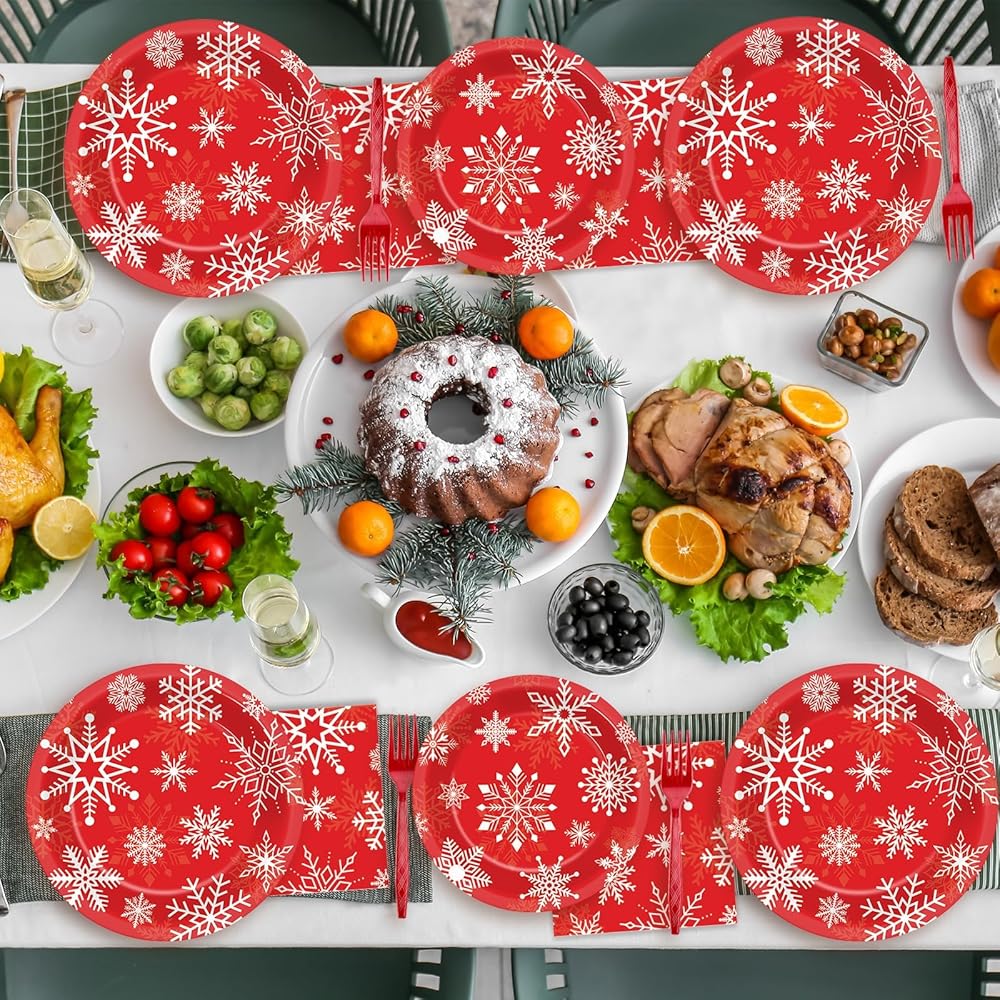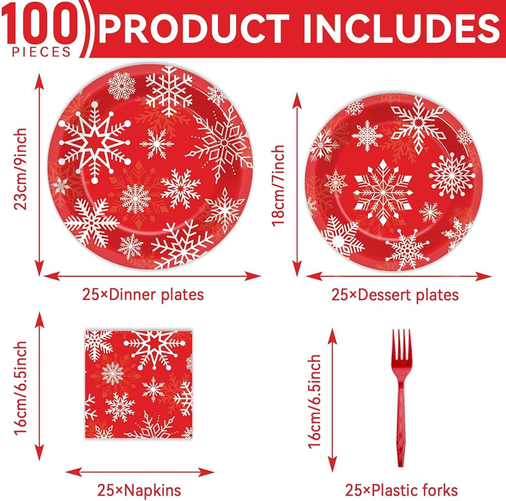 Package Includes:Christmas Party Decoration Tableware Set Total 100 Pieces,25 Sets of Christmas Snowflake Themed Tableware Sets for serving 25 guests, including 25 pcs 9 inch plates, 25 pcs 7 inch plates, 25 pcs 6.5inch napkins, 25 pcs 6.5inch forks. Plenty of quantity for your party needs.