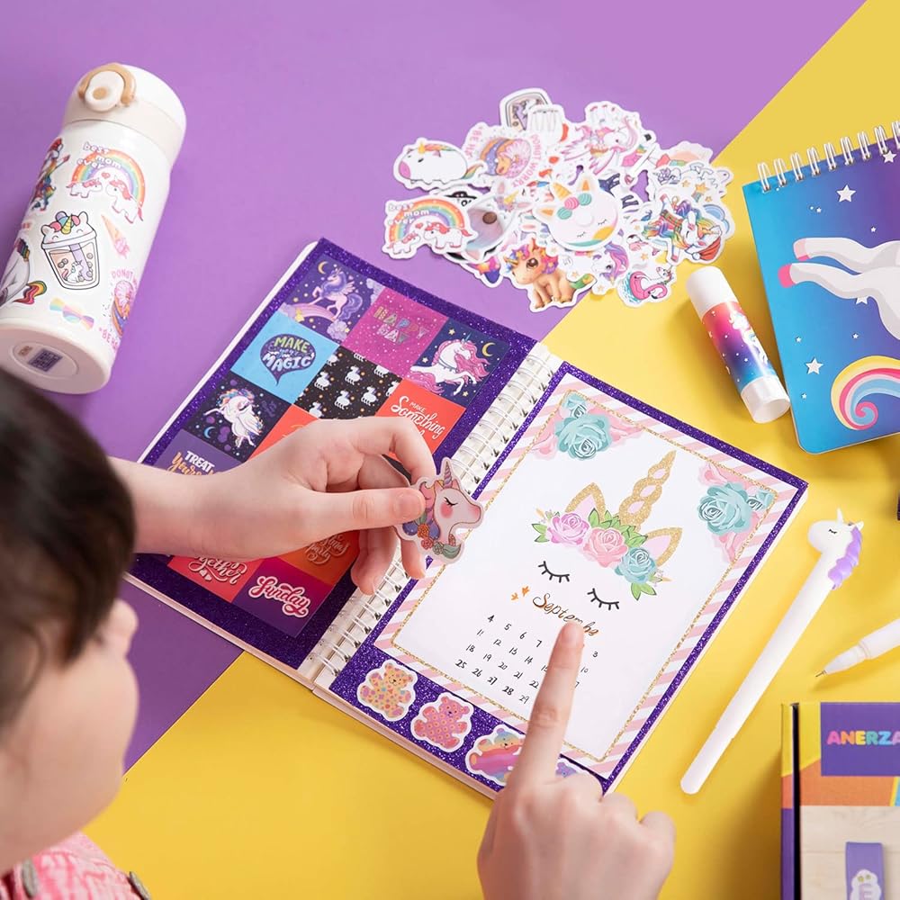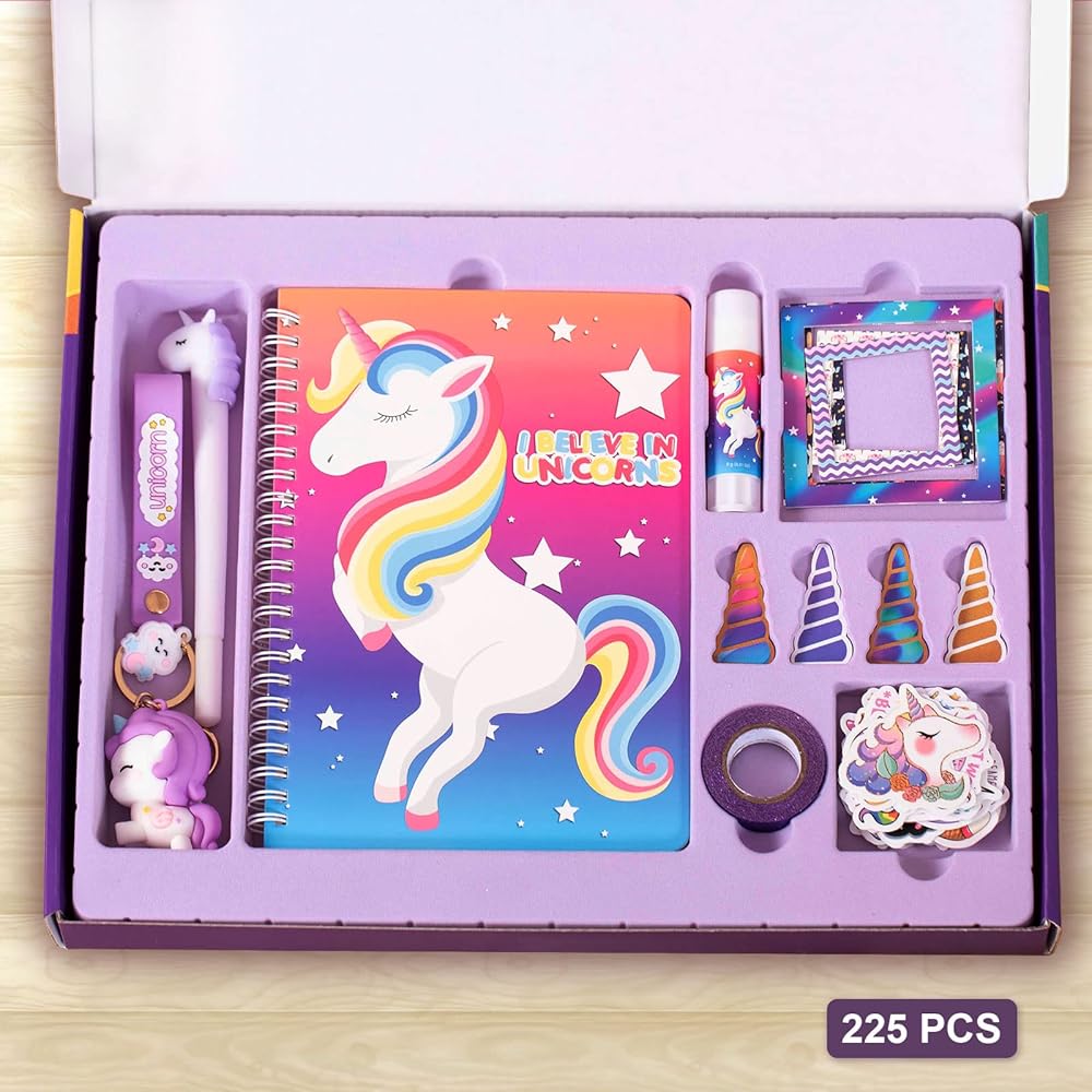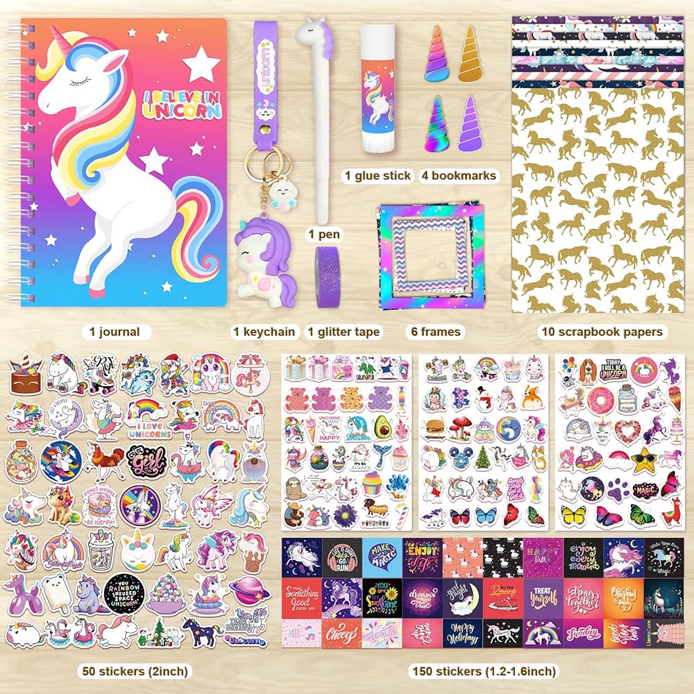 【WHAT YOU GET】The unicorn journal set has 225 items, Include 1 journal (70 page 6" x 8"), 1 pen, 1 glue stick, 1 keychain, 1 purple glitter tape, 3 frames(3" x 3" ), 3 frames( 2" x 2"), 4 bookmarks, 10 scrapbook papers, 200 stickers.