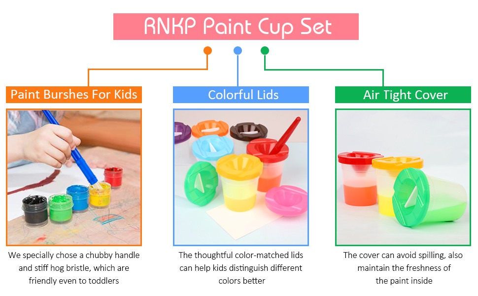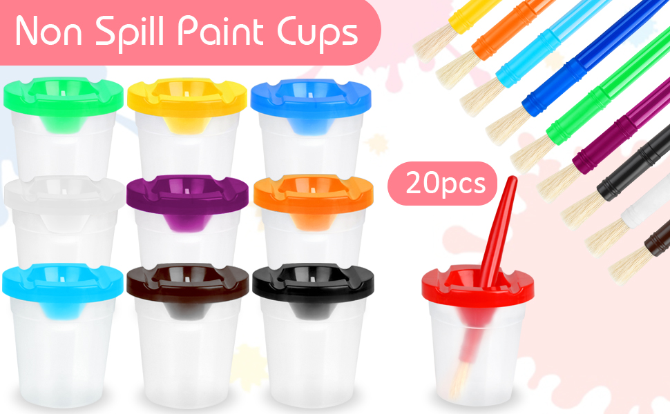 Spill-Proof & Anti-Drying: The paint cup is made of non-toxic plastic, safe for kids and easy to wash. Its funnel-shaped lids can effectively prevent spilling, no more mess after painting. It also comes with air-tight plugs which help keep your paint fresh between art creation, no more paint wastes.