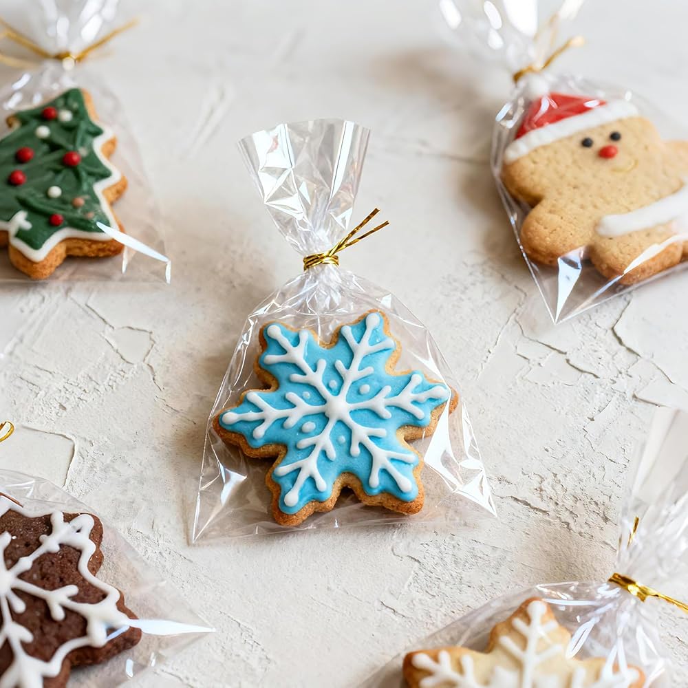 【PACKAGE INCLUDES】100 pieces cellophane bags and 100 pieces gold twist ties, the quantity can meet your various needs for wrapping cookies, candies, snacks, chocolates, marshmallows, gift,etc